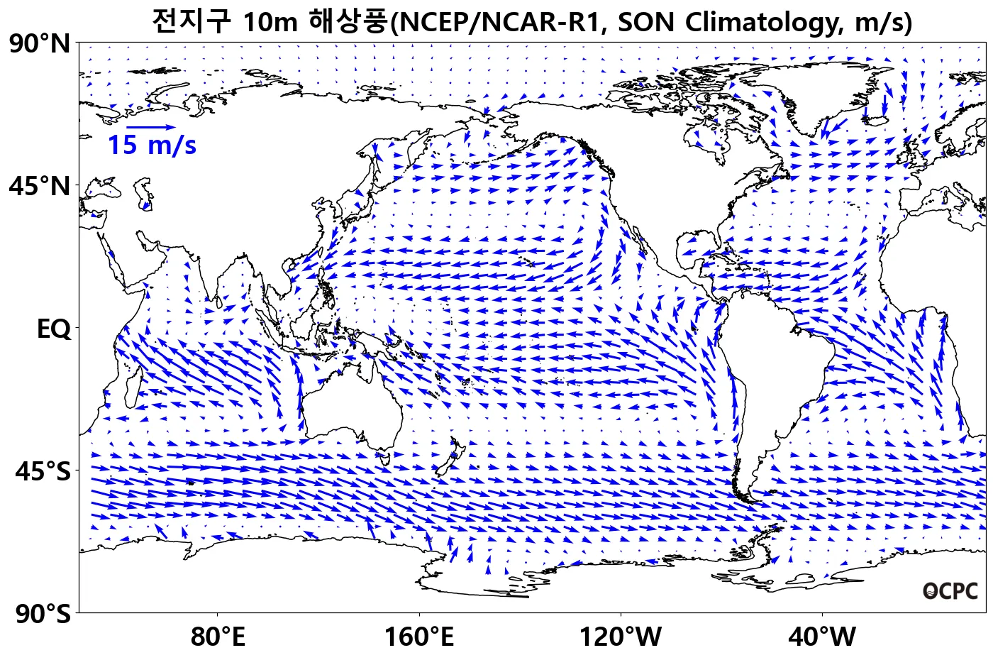 전지구 및 동아시아해역 해상풍속은 평년보다 강하겠습니다.