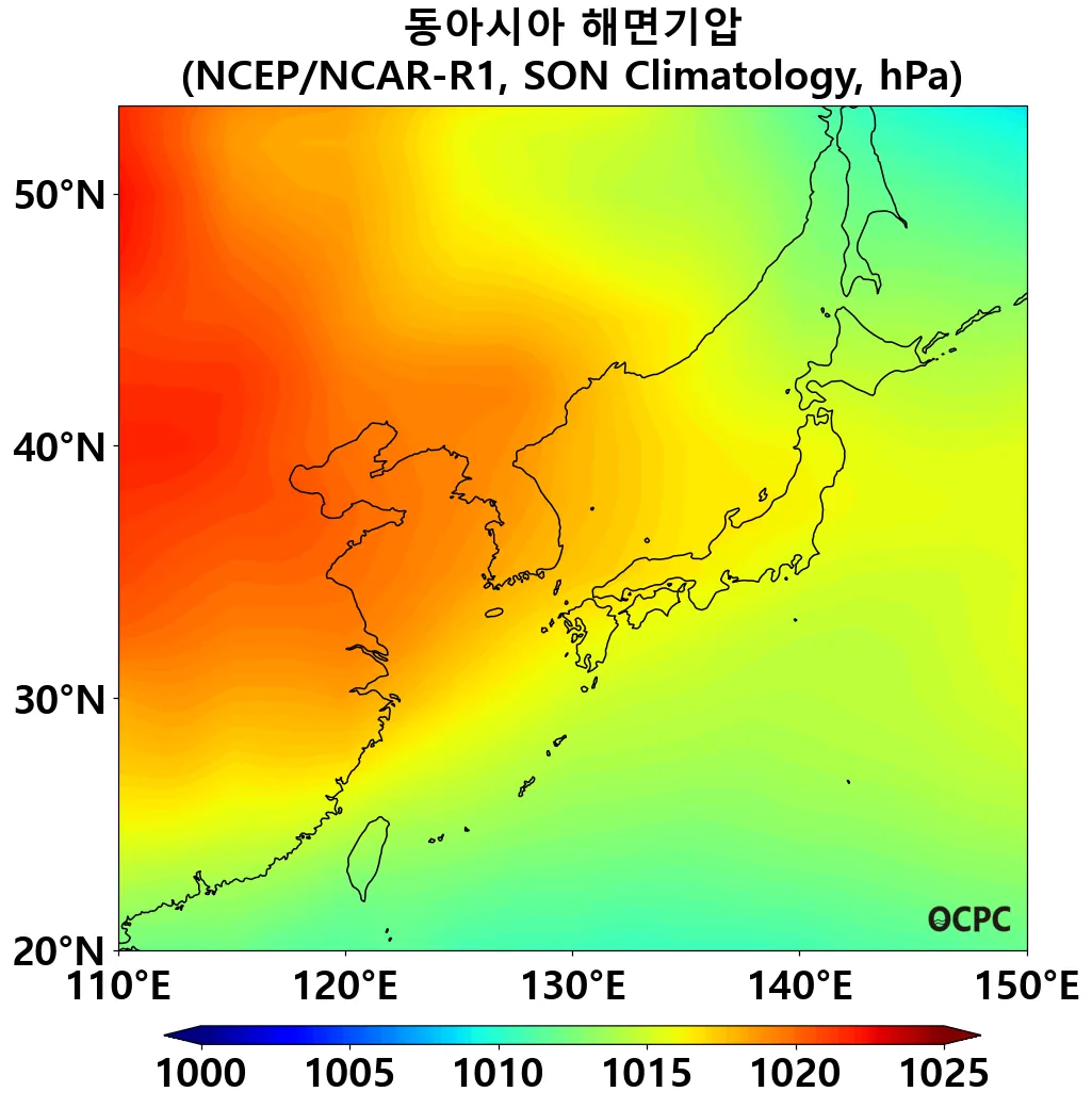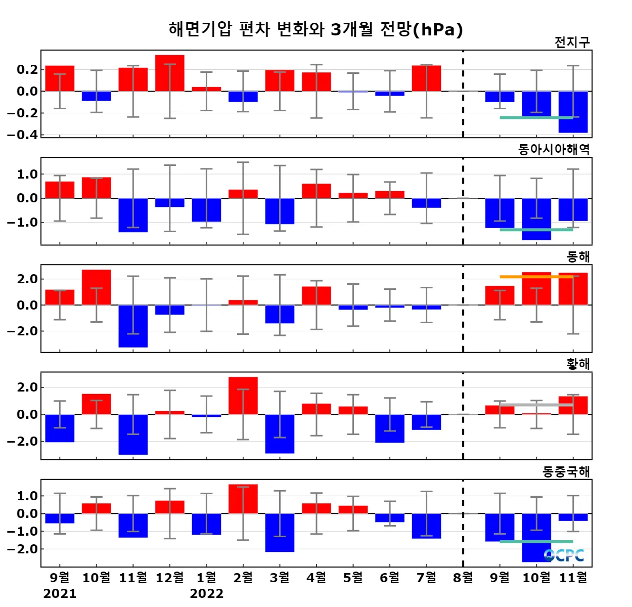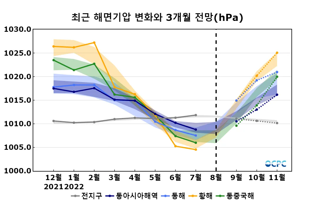 동해의 해면기압은 평년보다 높겠으며, 동중국해는 평년보다 낮겠습니다. 황해는 평년과 비슷하겠습니다.