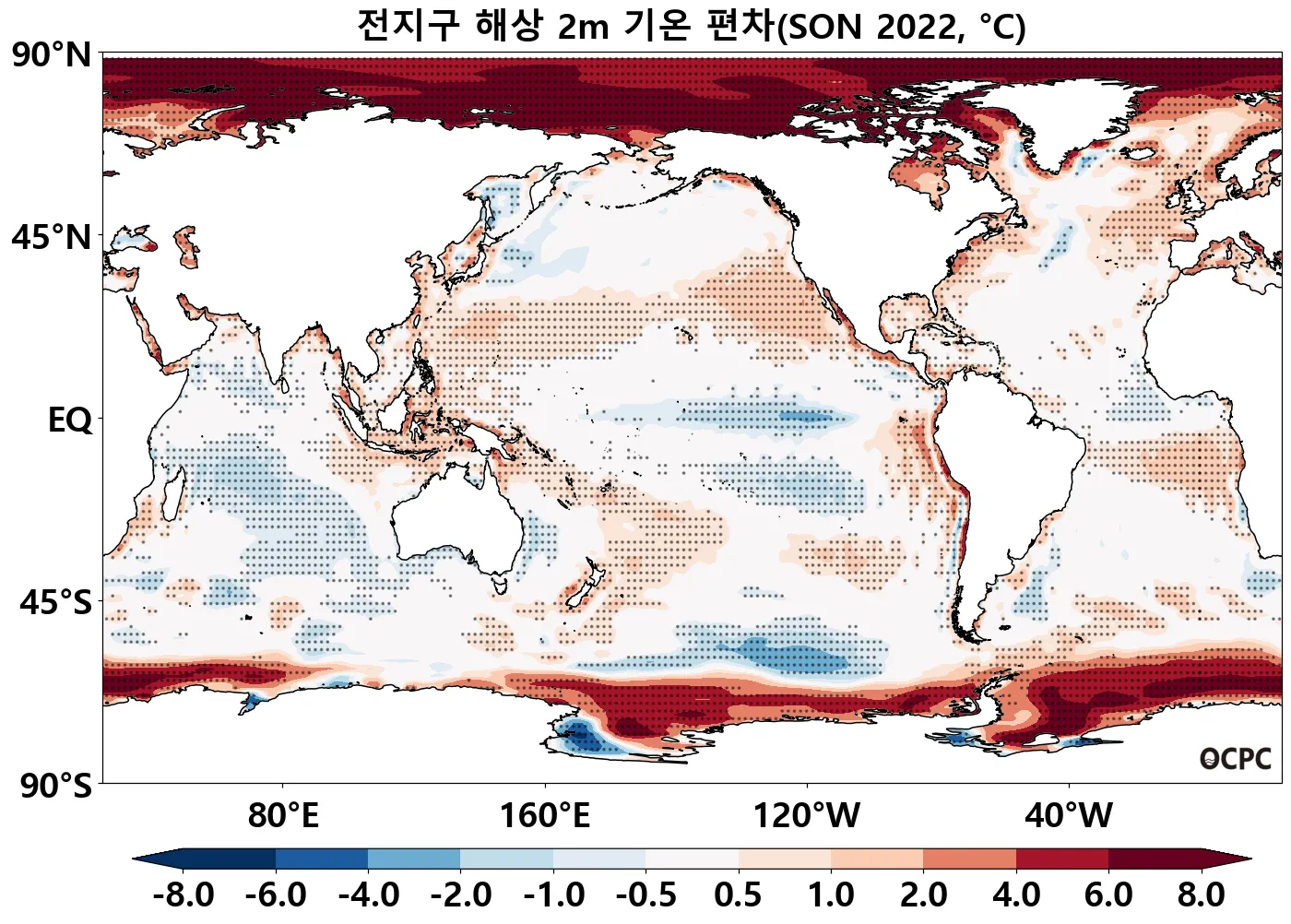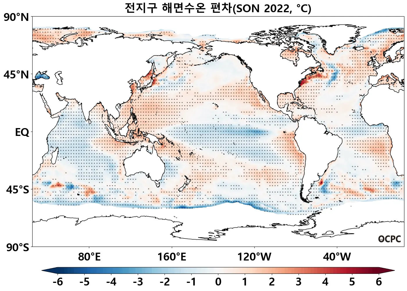 A-B. 전지구 해상기온 편차 전망(2022년 9~11월 평균, 점표시: 평년 표준편차 초과 해역)