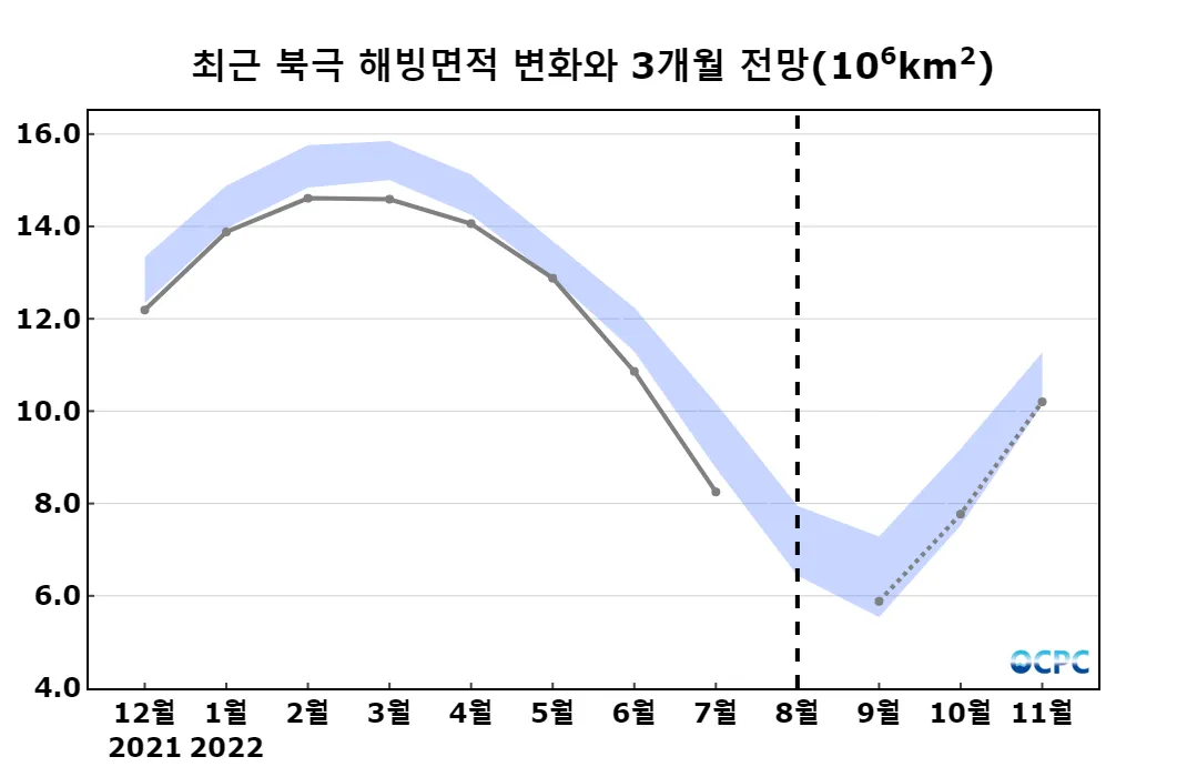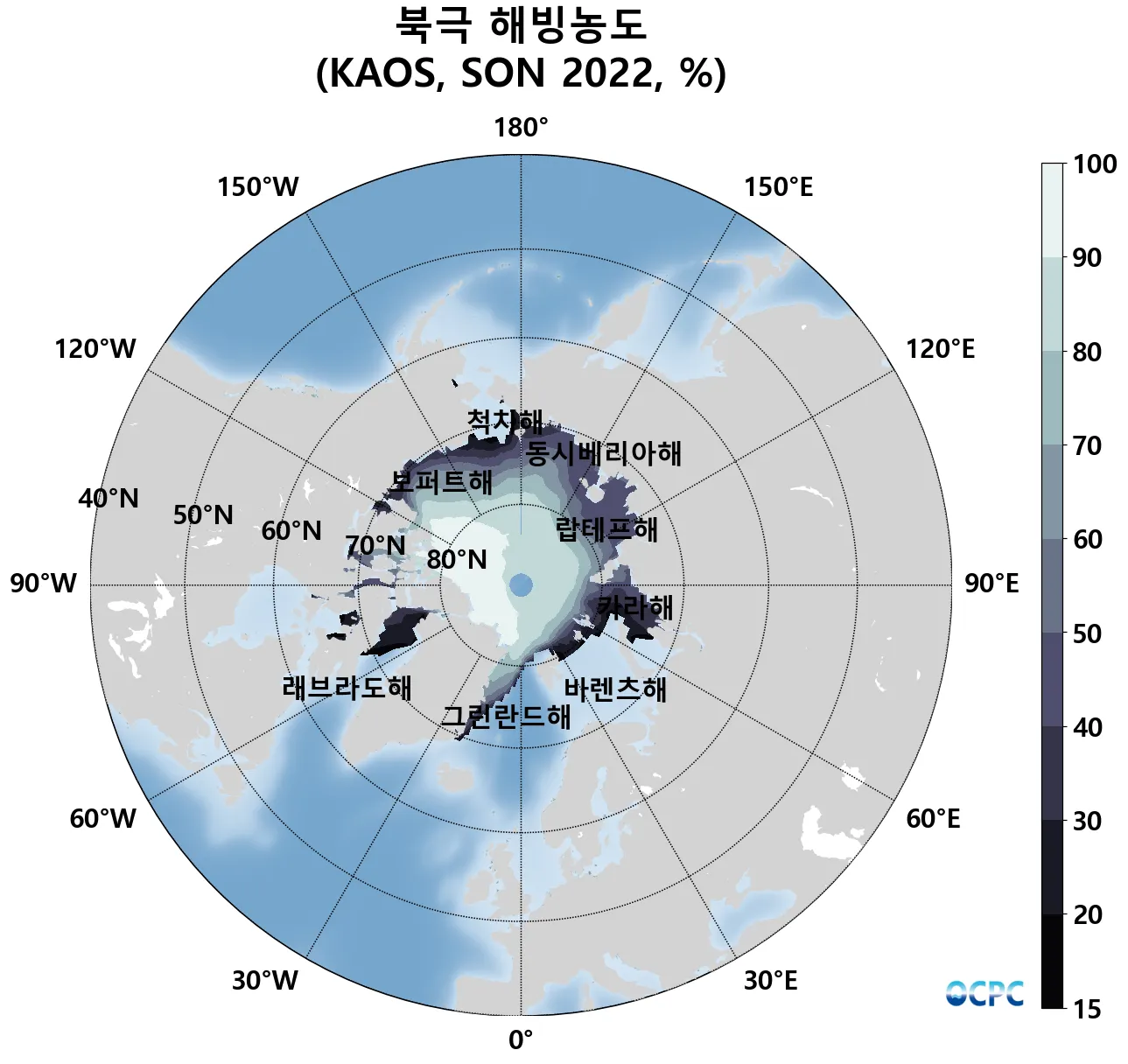 A. 북극 해빙농도 전망(2022년 9~11월 평균, 15% 이상 해역)