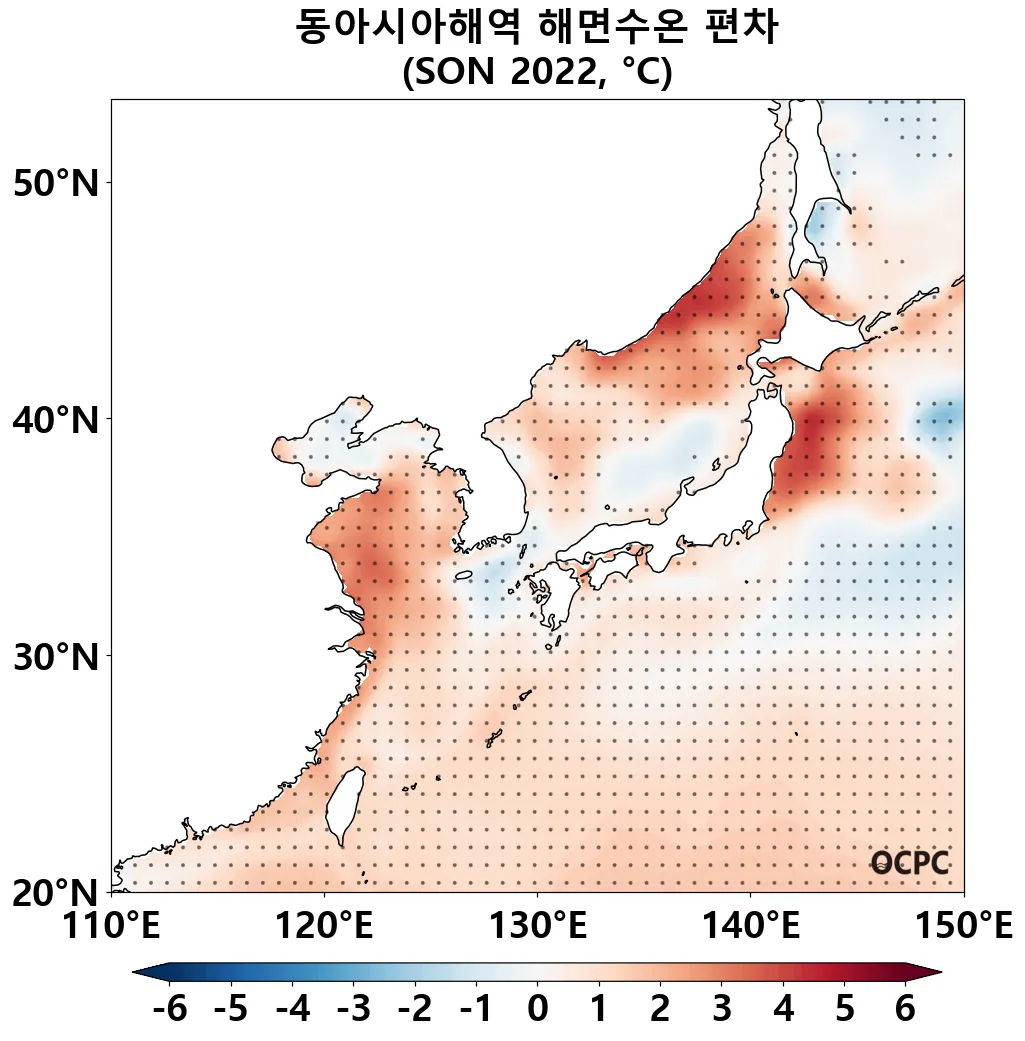 A-B. 동아시아해역 해상기온 편차 전망(2022년 9~11월 평균, 점표시: 평년 표준편차 초과 해역)