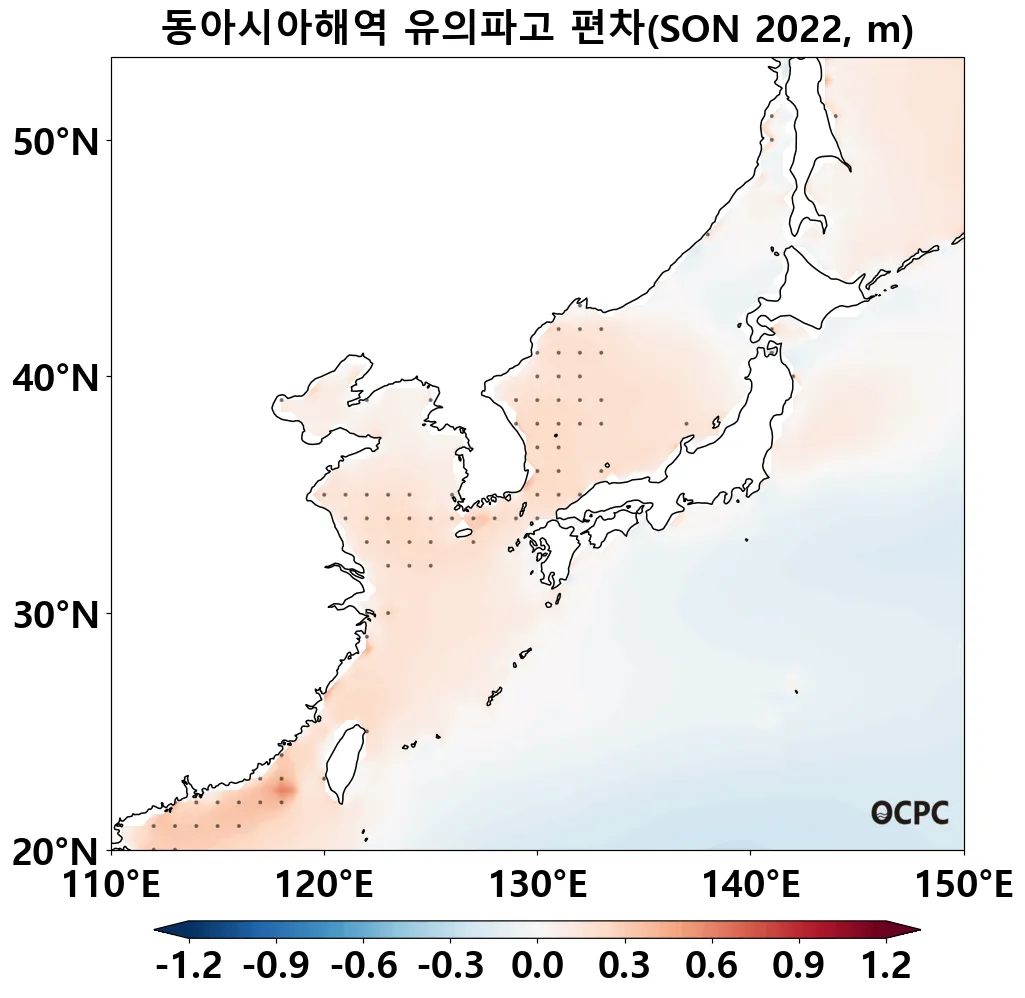 A-B. 동아시아해역 유의파고 편차 전망(2022년 9~11월 평균, 점표시: 평년 표준편차 초과 해역)