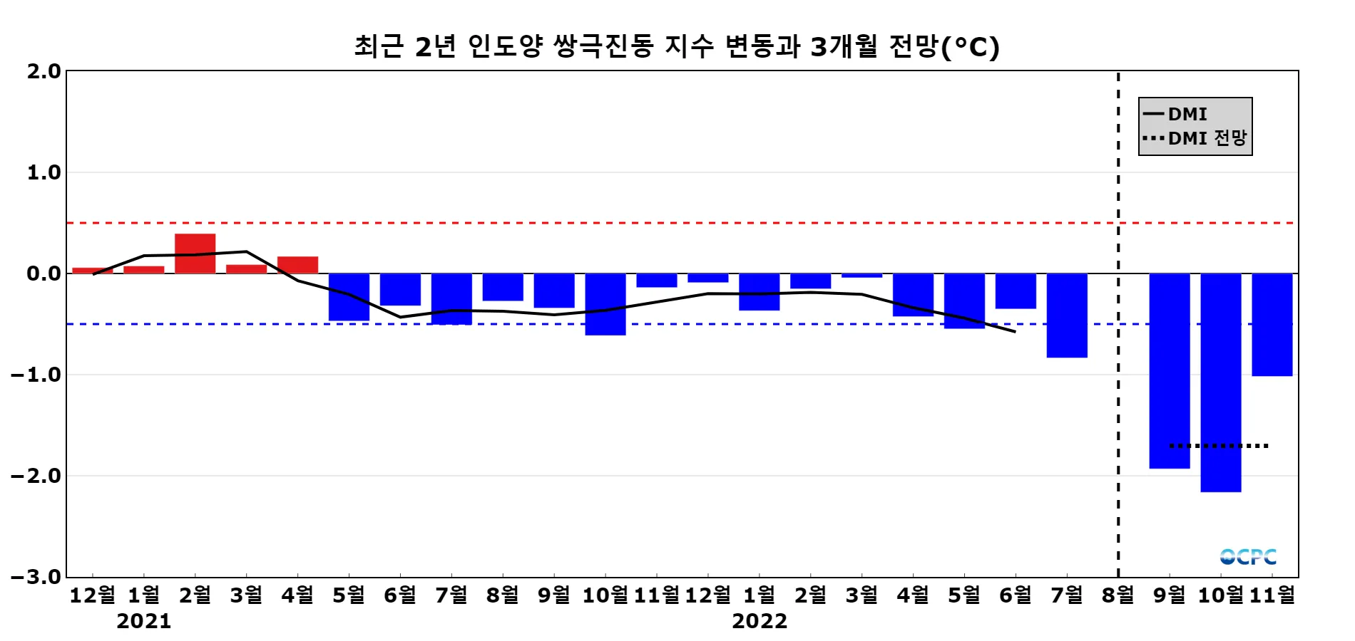 인도양 쌍극진동 지수 DMI (Dipole Mode Index)는 WTIO 해역의 평년 대비 편차에서 SETIO 해역의 평년 대비 편차를 뺀 값으로 월평균 해면수온 편차(채색부분)를 3개월 이동평균하여 나타낸 지수(검정색 실선)로 0.5보다 크면 양의 상태, -0.5보다 작으면 음의 상태로 판정합니다. 과거 지수(최근 2년)는 OISSTv2.1, 전망은 CFSv2 자료에서 산출하였으며, 검정색 점선은 3개월 전망값의 평균값을 나타냅니다.