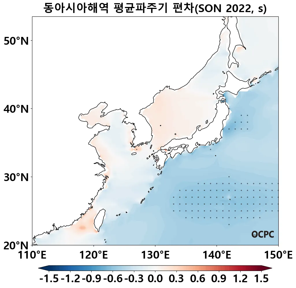 A-B. 동아시아해역 평균파주기 편차 전망(2022년 9~11월 평균, 점표시: 평년 표준편차 초과 해역)