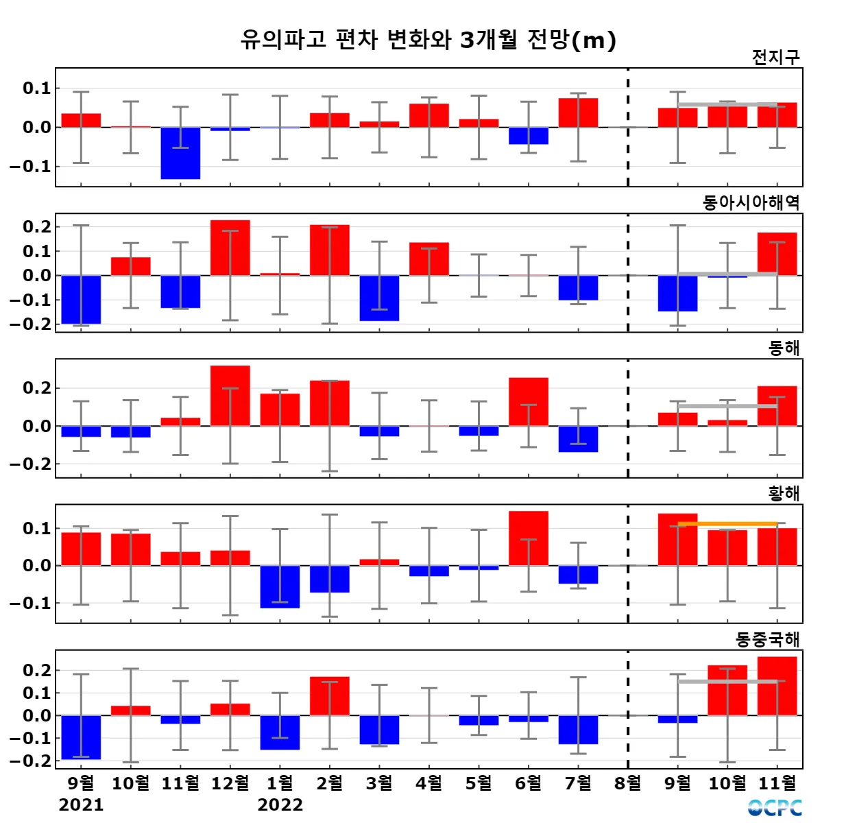 황해의 평균 유의파고는 평년보다 높고, 동해, 동중국해는 평년과 비슷할 것으로 전망됩니다.