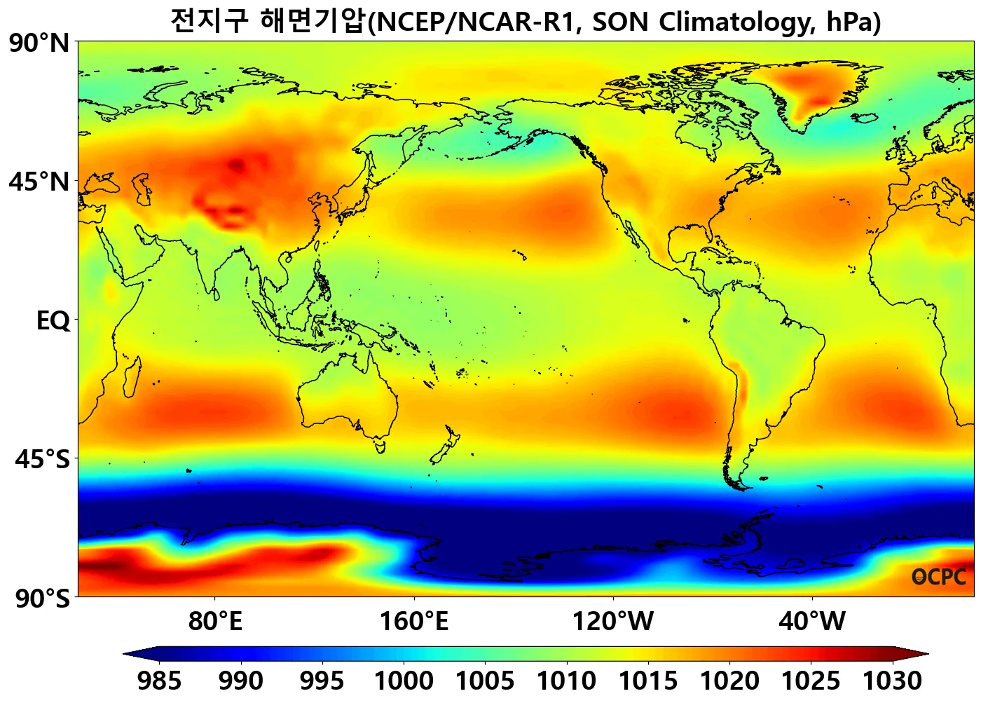 ○ (해면기압) 전지구, 동아시아해역, 동중국해의 해면기압은 평년보다 낮겠으며, 동해는 평년보다 높겠습니다. 황해는 평년과 비슷하겠습니다.