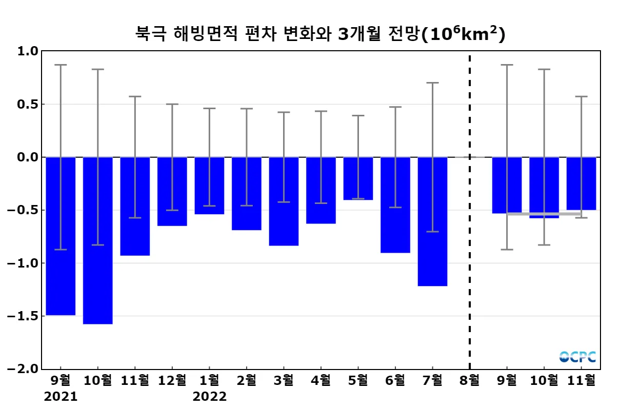북극 해빙농도는 전 북극해역에 걸쳐 평년보다 감소할 것으로 전망됩니다.