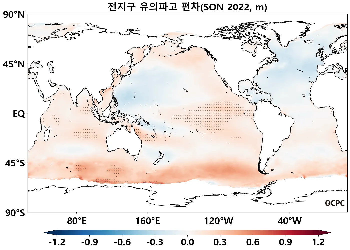A-B. 전지구 평균파주기 편차 전망(2022년 9~11월 평균, 점표시: 평년 표준편차 초과 해역)