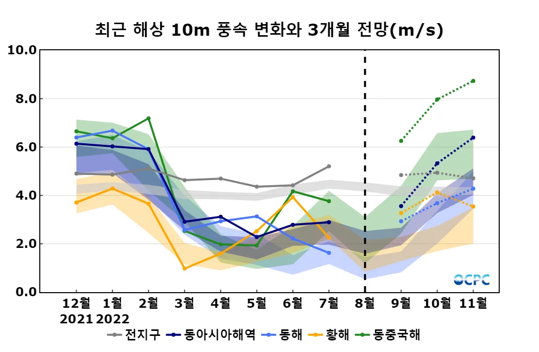 ○ (해상풍) 전지구, 동아시아해역, 동해, 황해, 동중국해의 해상풍속은 평년보다 강하겠습니다.
