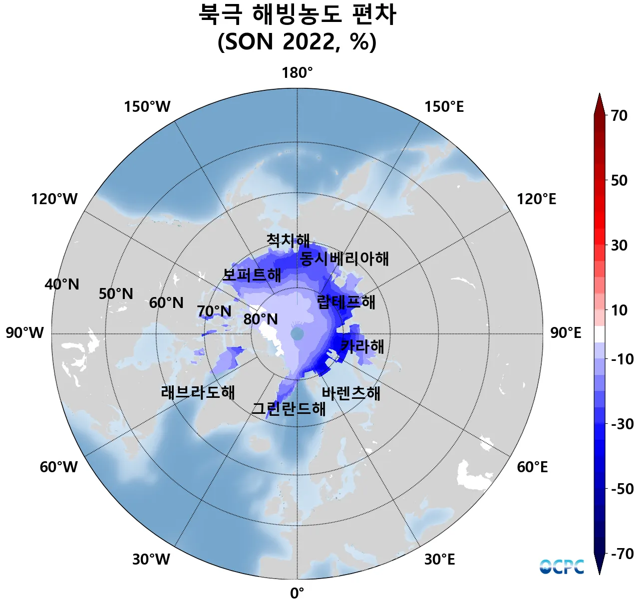 A-B. 북극 해빙농도 편차 전망(2022년 9~11월 평균, 15% 이상 해역)