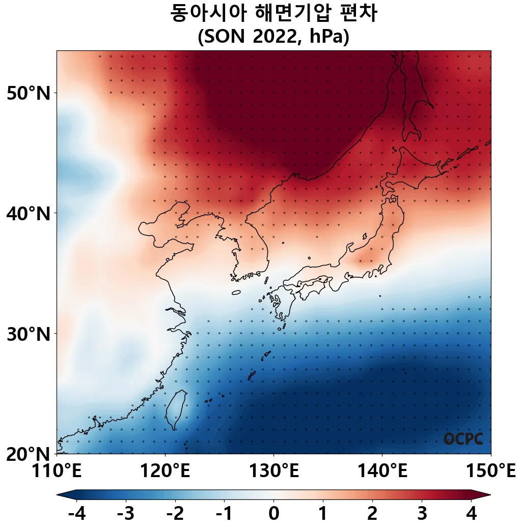 A-B. 동아시아 해면기압 편차 전망(2022년 9~11월 평균, 점표시: 평년 표준편차 초과 해역)