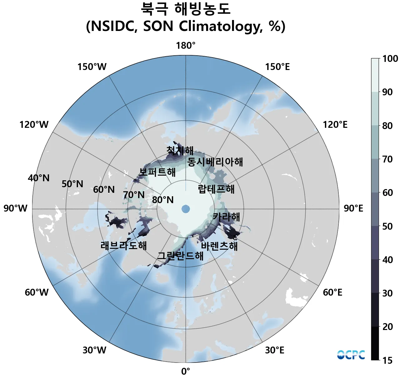 B. 북극 해빙농도(9~11월 평년평균, 15% 이상 해역)