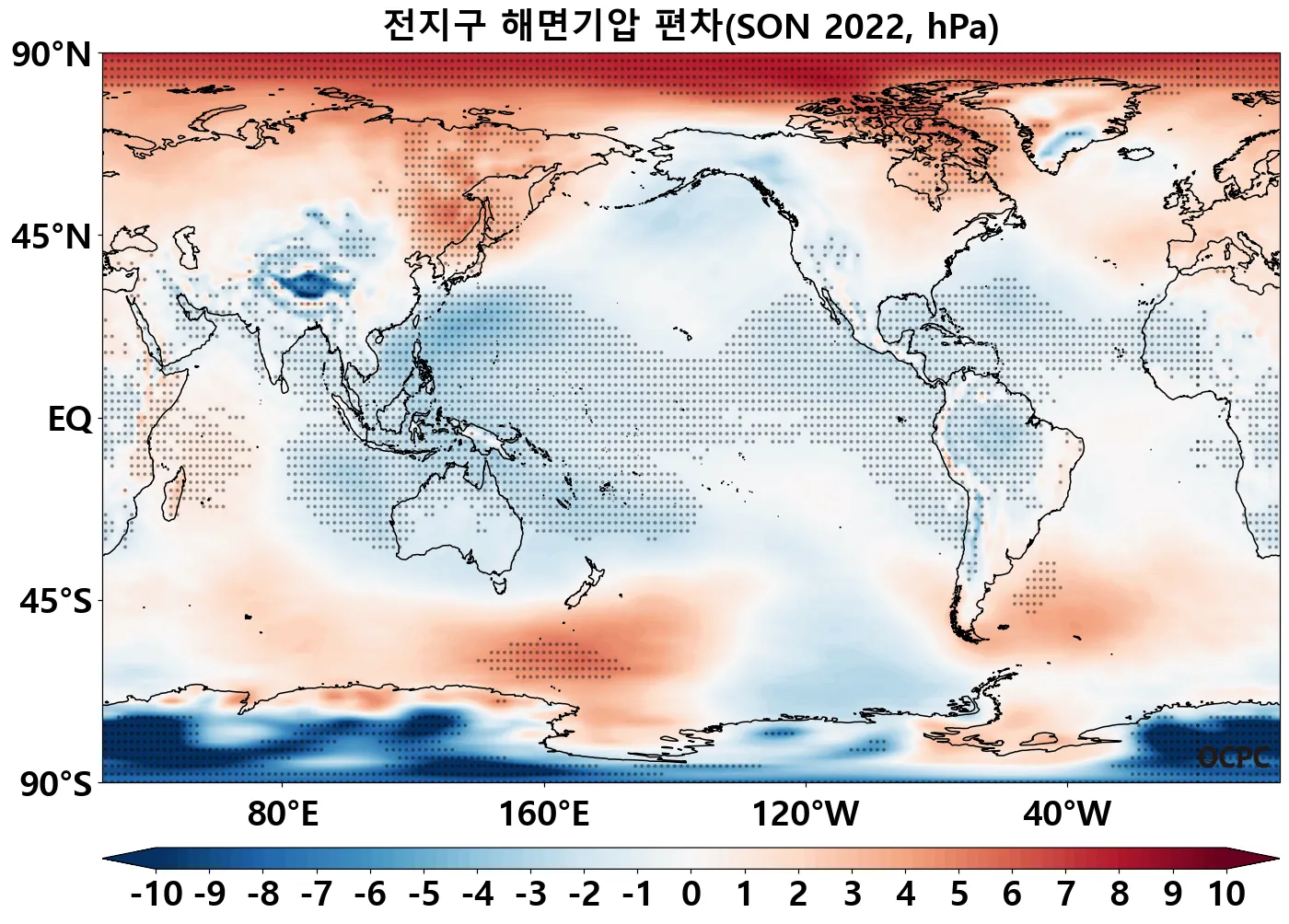 A-B. 전지구 해면기압 편차 전망(2022년 9~11월 평균, 점표시: 평년 표준편차 초과 해역)