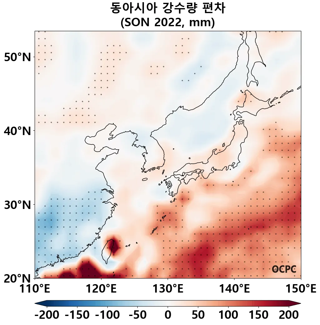 A-B. 동아시아 강수량 편차 전망(2022년 9~11월 평균, 점표시: 평년 표준편차 초과 해역)
