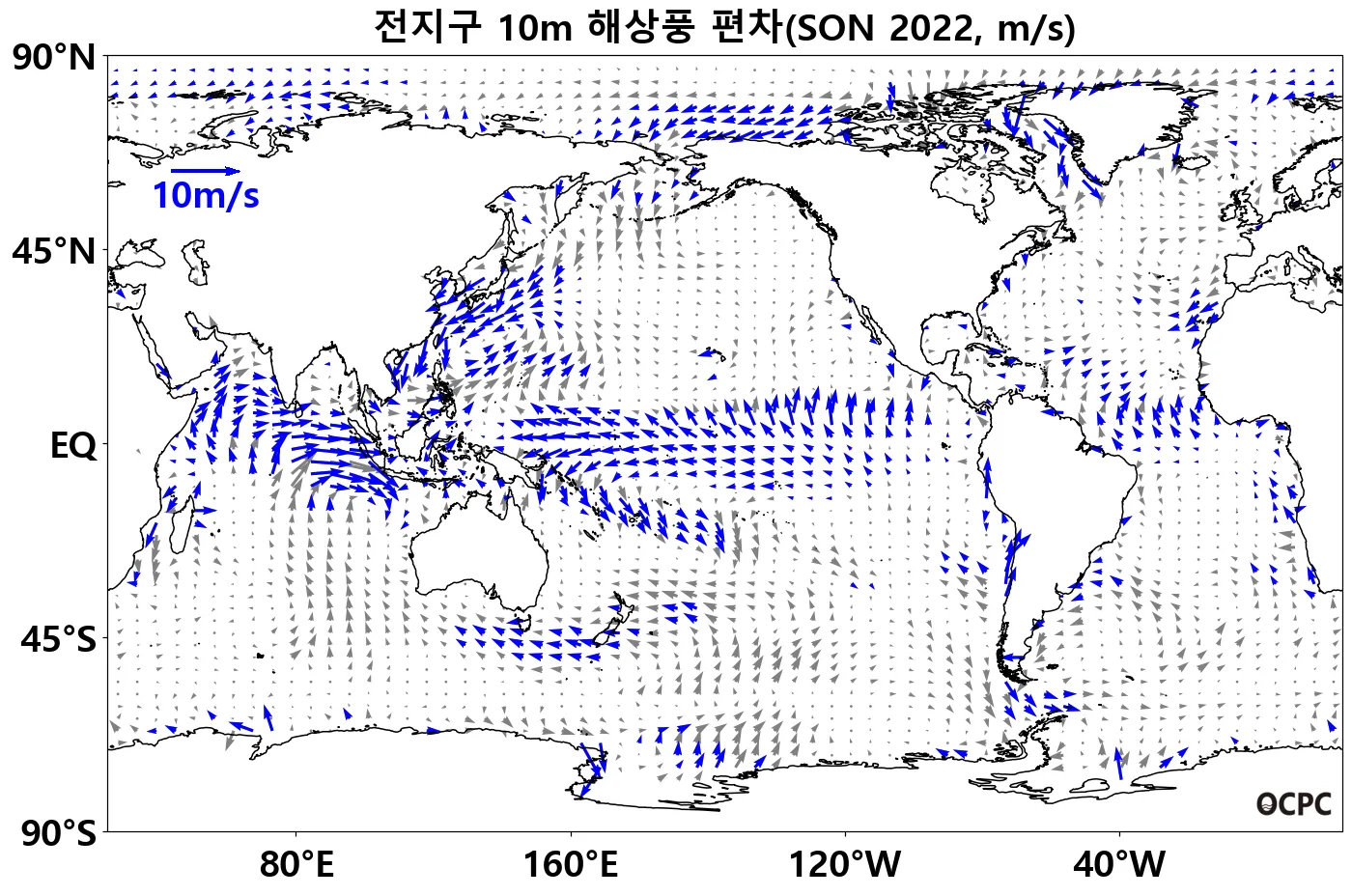 A-B. 전지구 해상풍 편차 전망(2022년 9~11월 평균, 청색벡터: 평년 표준편차 초과 해역)