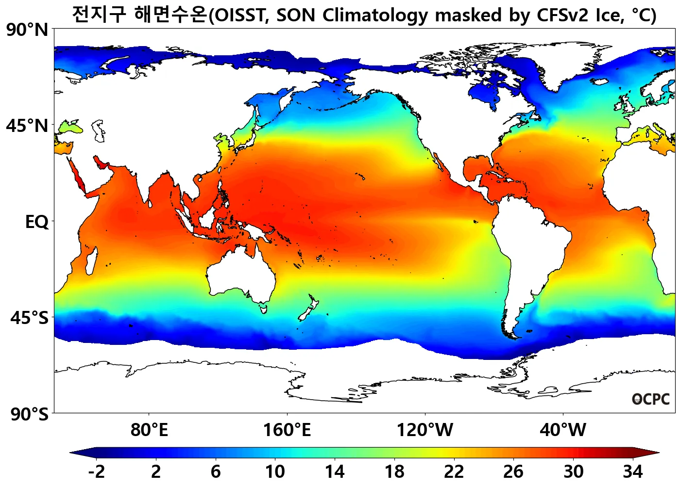 B. 전지구 해면수온(9~11월 평년평균), 예상 해빙 해역 제외