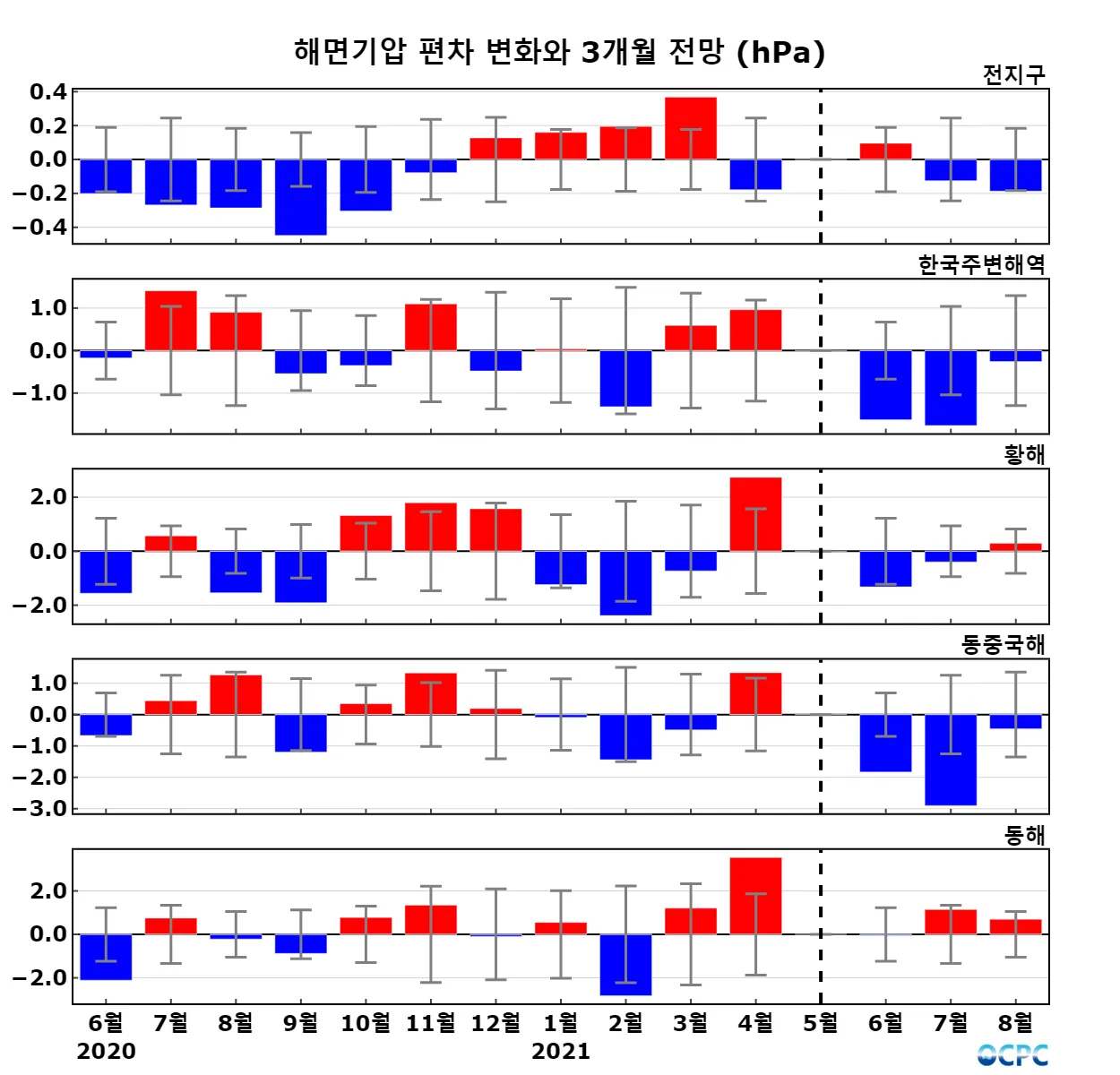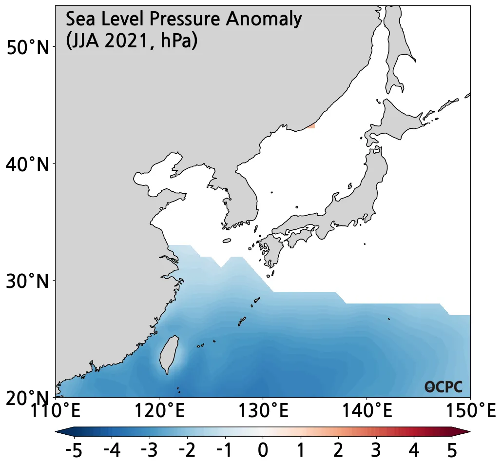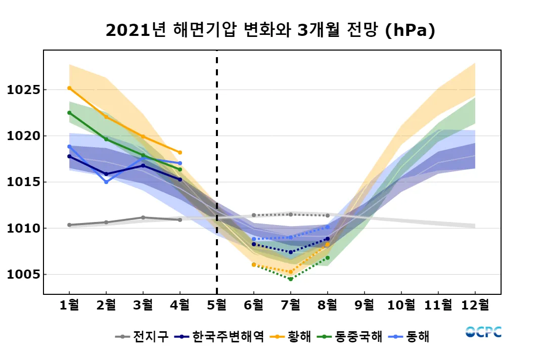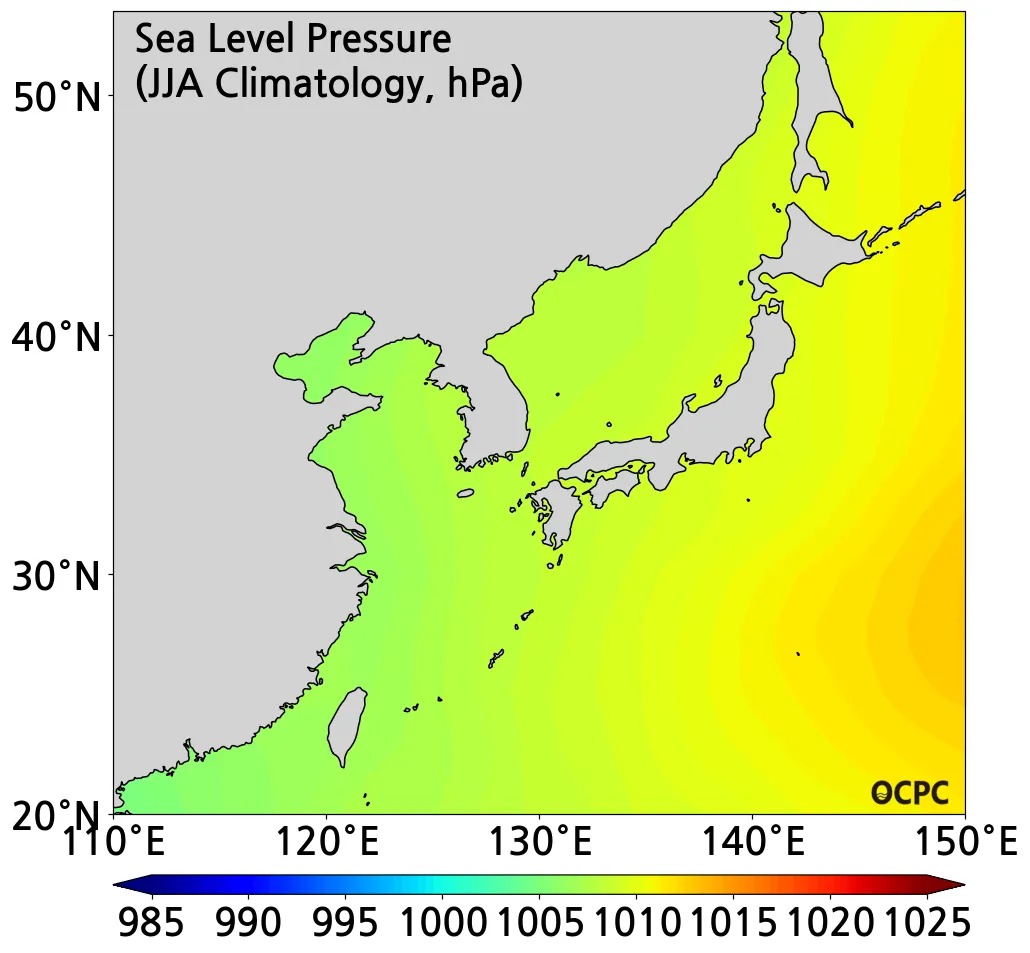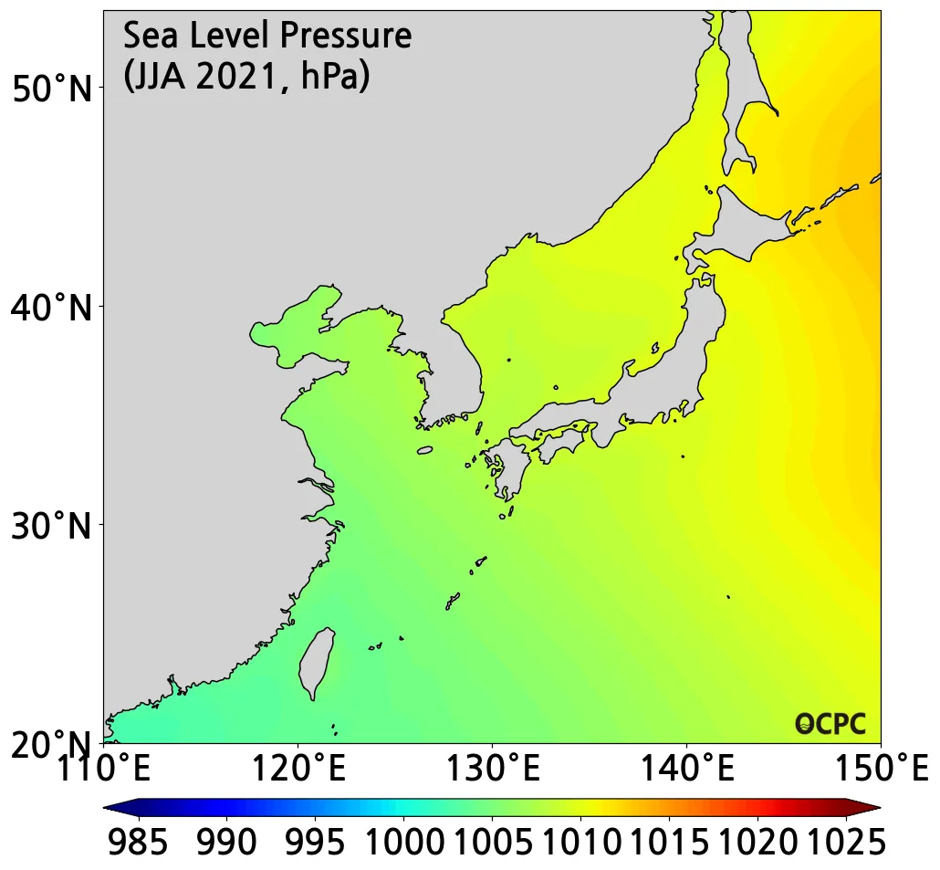 한국주변해역과 동중국해의 6,7월 해면기압은 평년보다 낮겠으며, 8월 해면기압은 평년과 비슷하겠습니다.