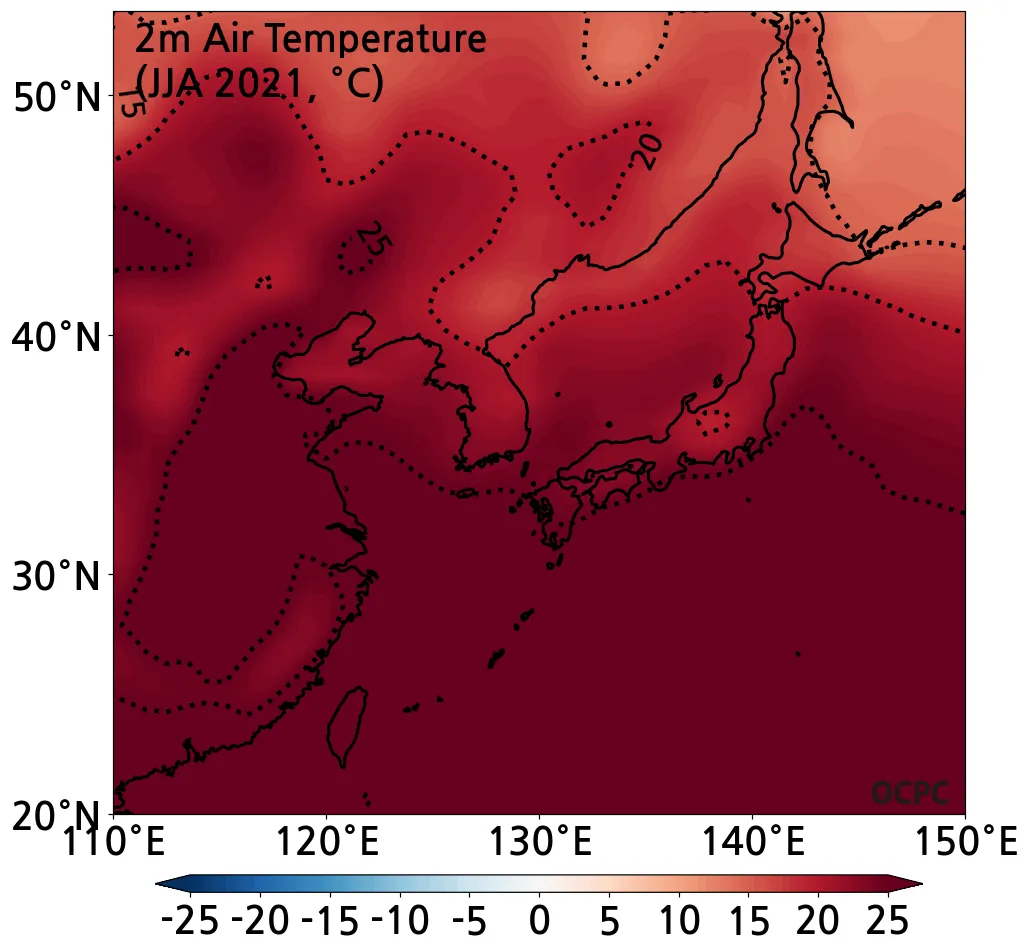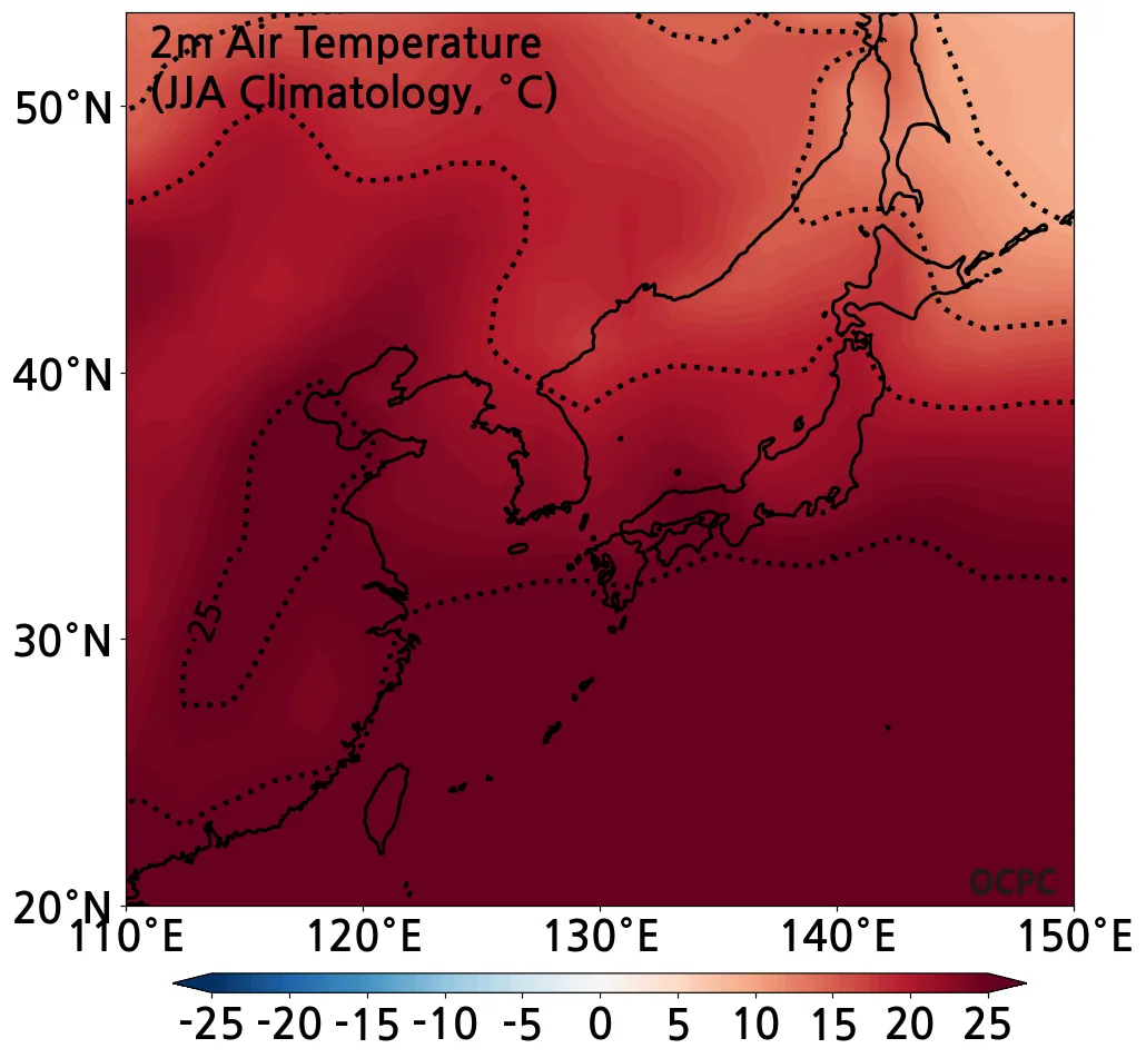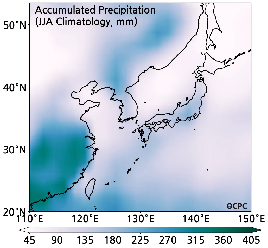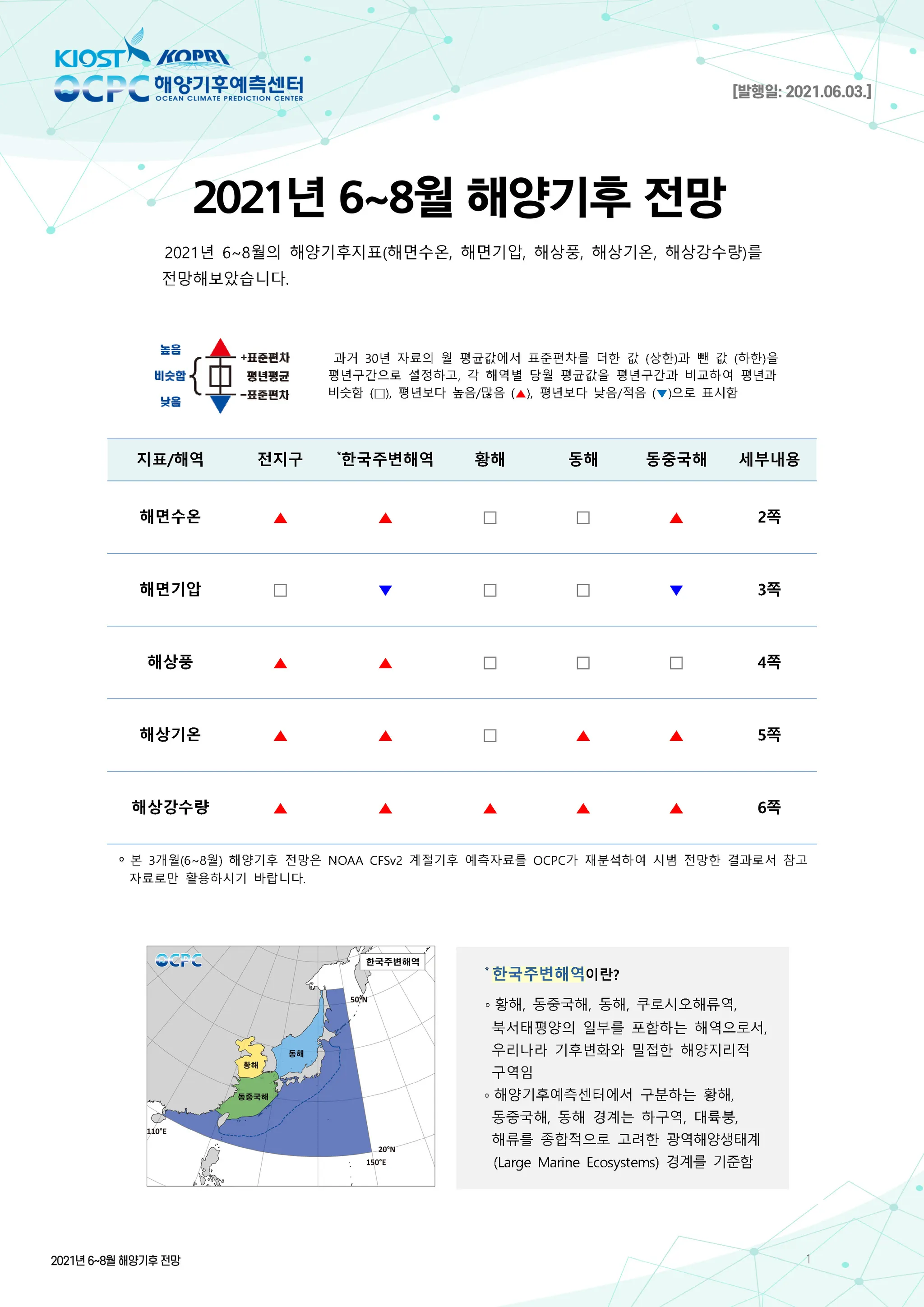 한국주변해역과 동중국해의 6,7월 해면기압은 평년보다 낮겠으며, 8월 해면기압은 평년과 비슷하겠습니다.
