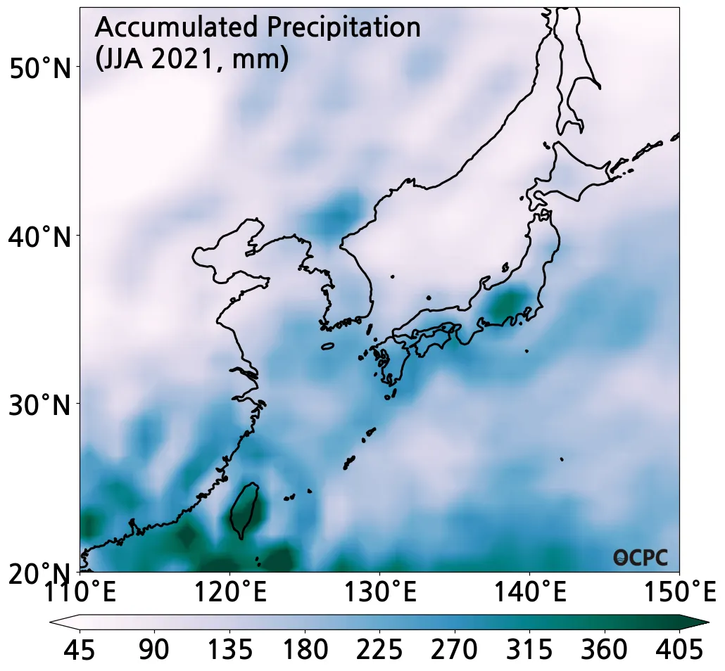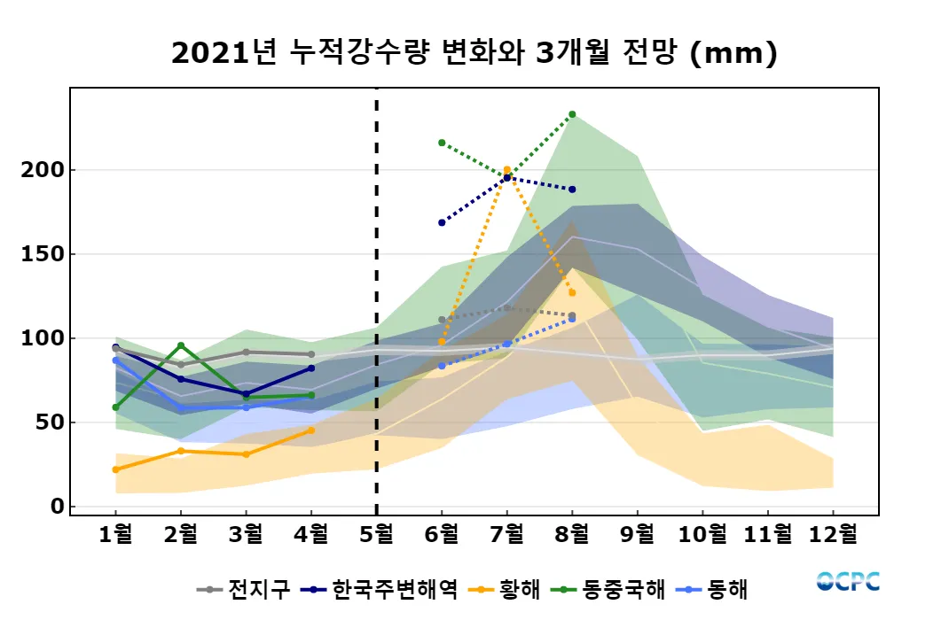 한국주변해역 누적강수량 전망(2021년 6~8월 평균)