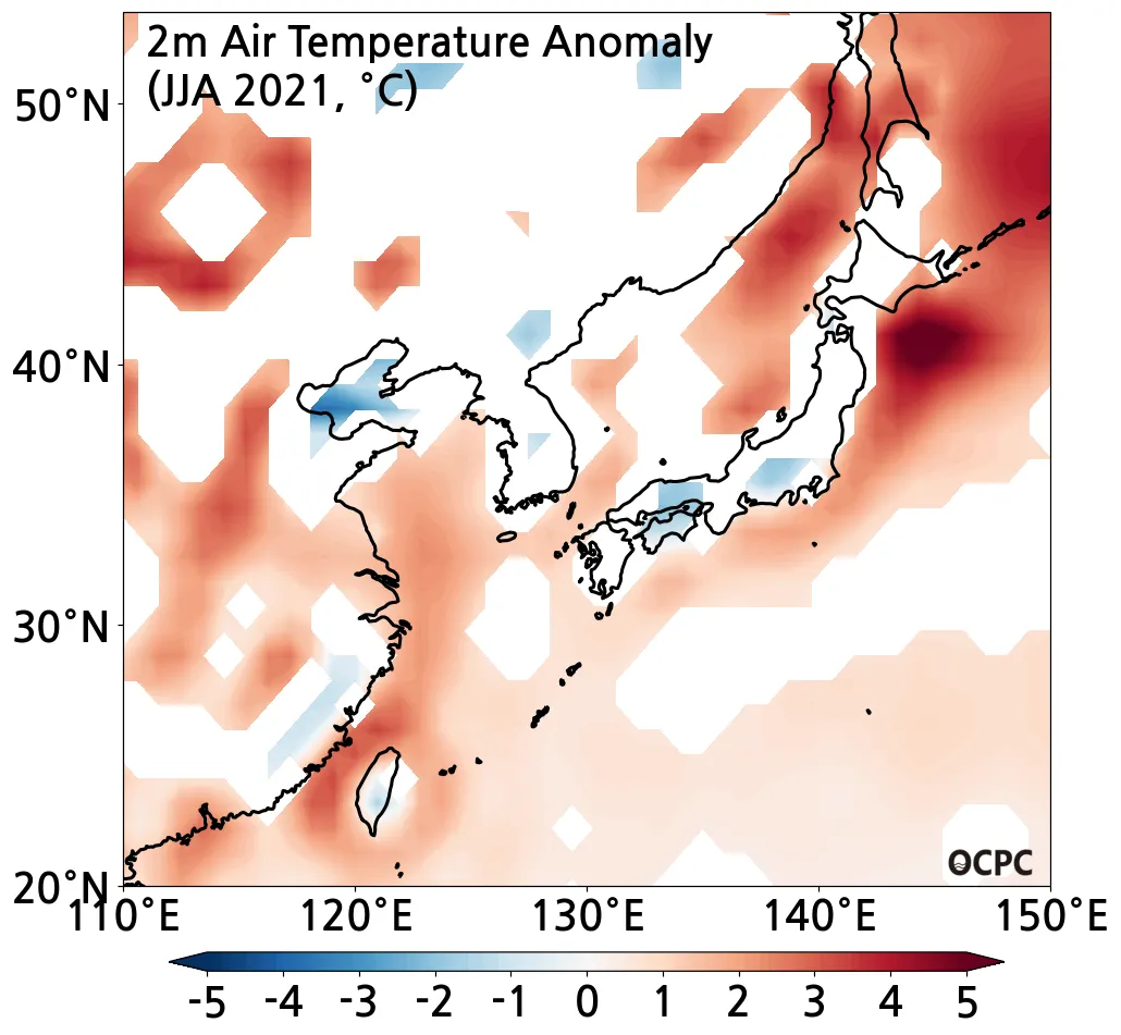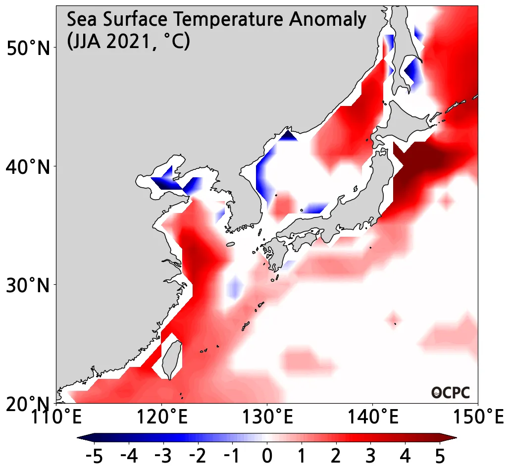 한국주변해역 해상기온 편차 전망(2021년 6~8월 평균, 채색표시: 평년 표준편차 초과 해역)