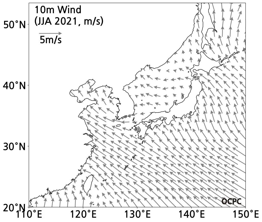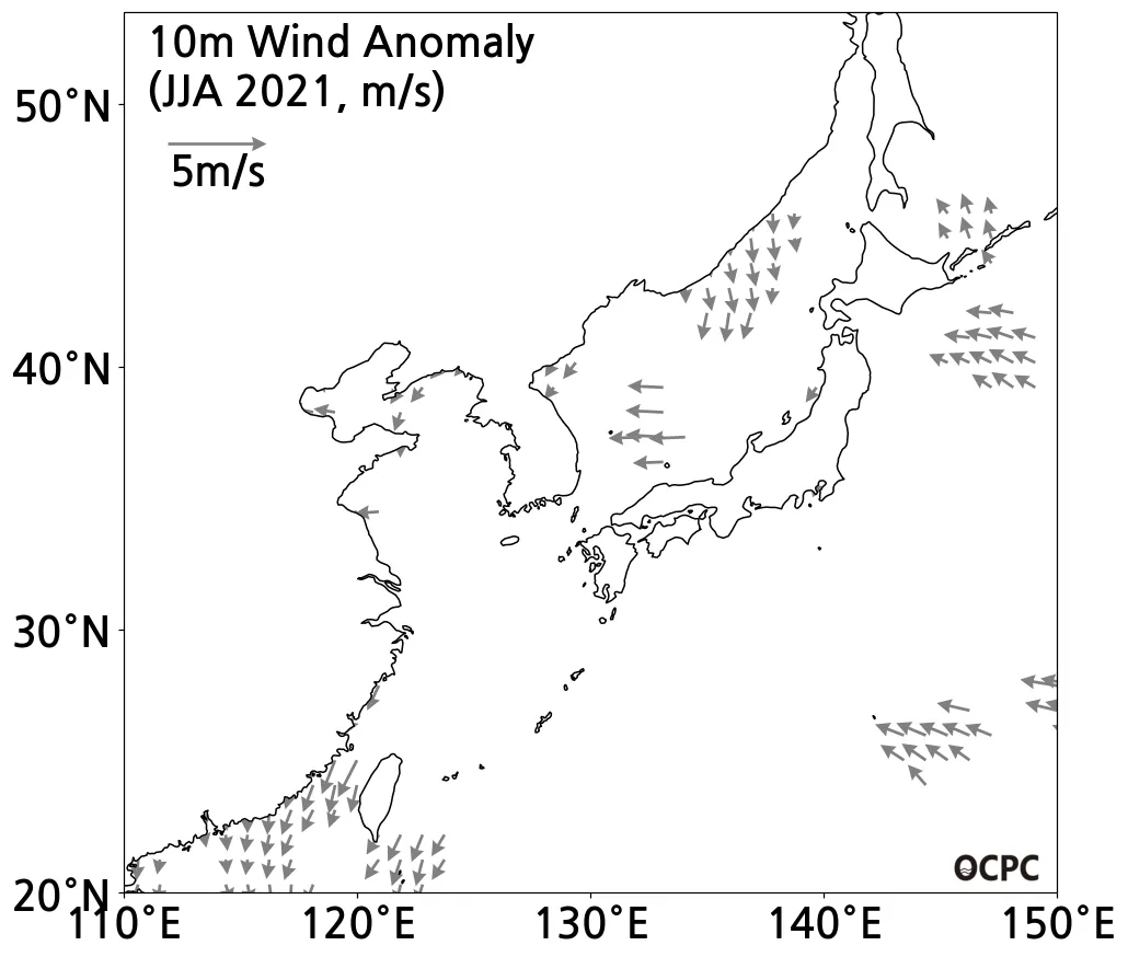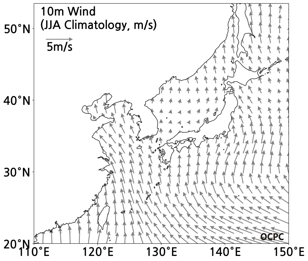 한국주변해역 해상풍 전망(2021년 6~8월 평균)