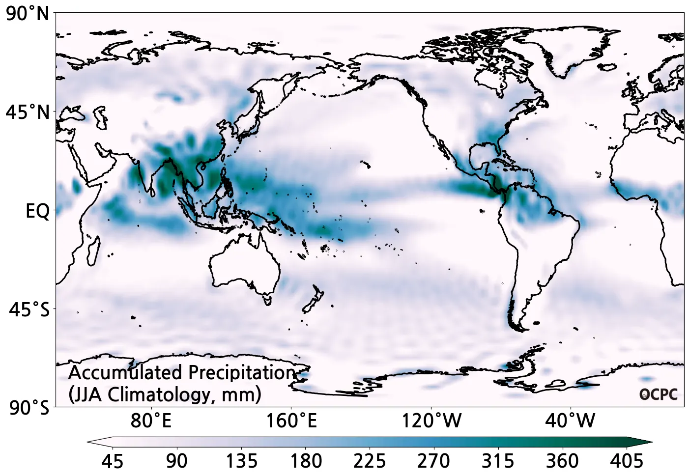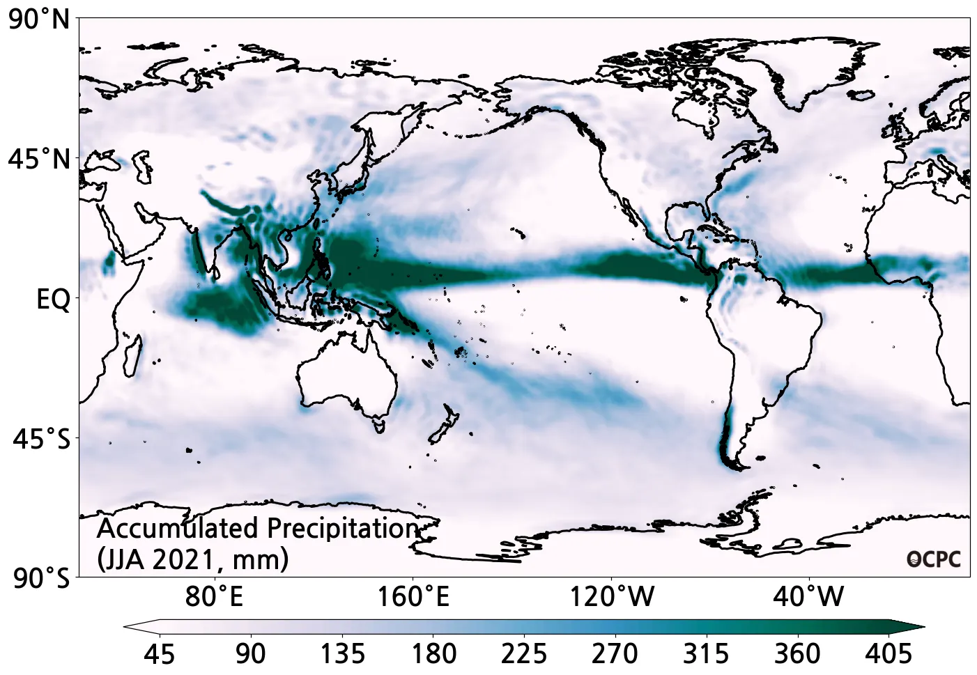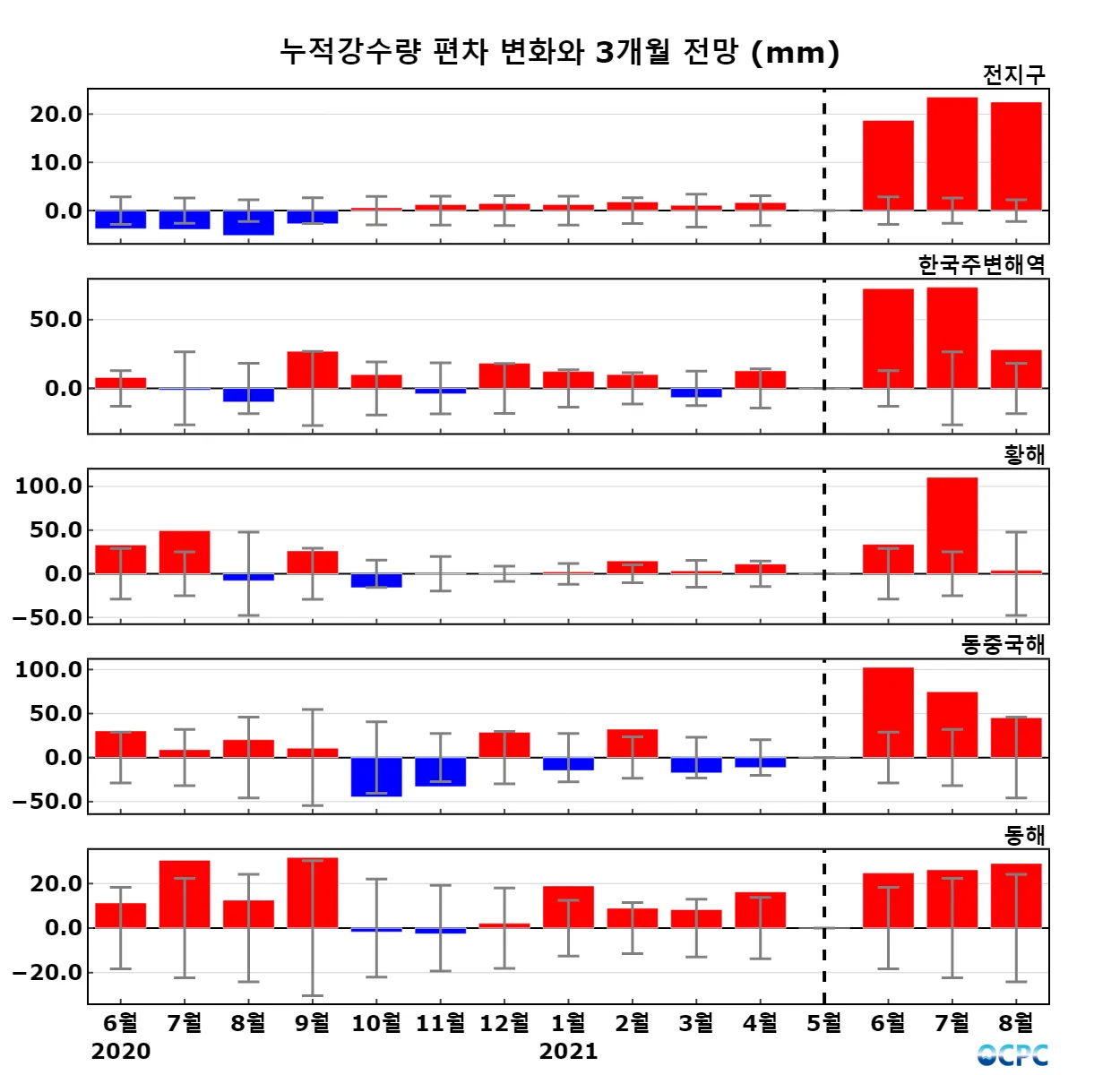 전지구 누적강수량 전망(2021년 6~8월 평균)