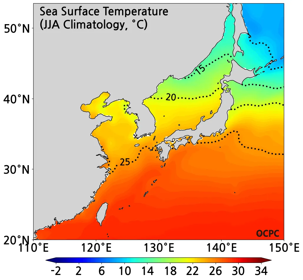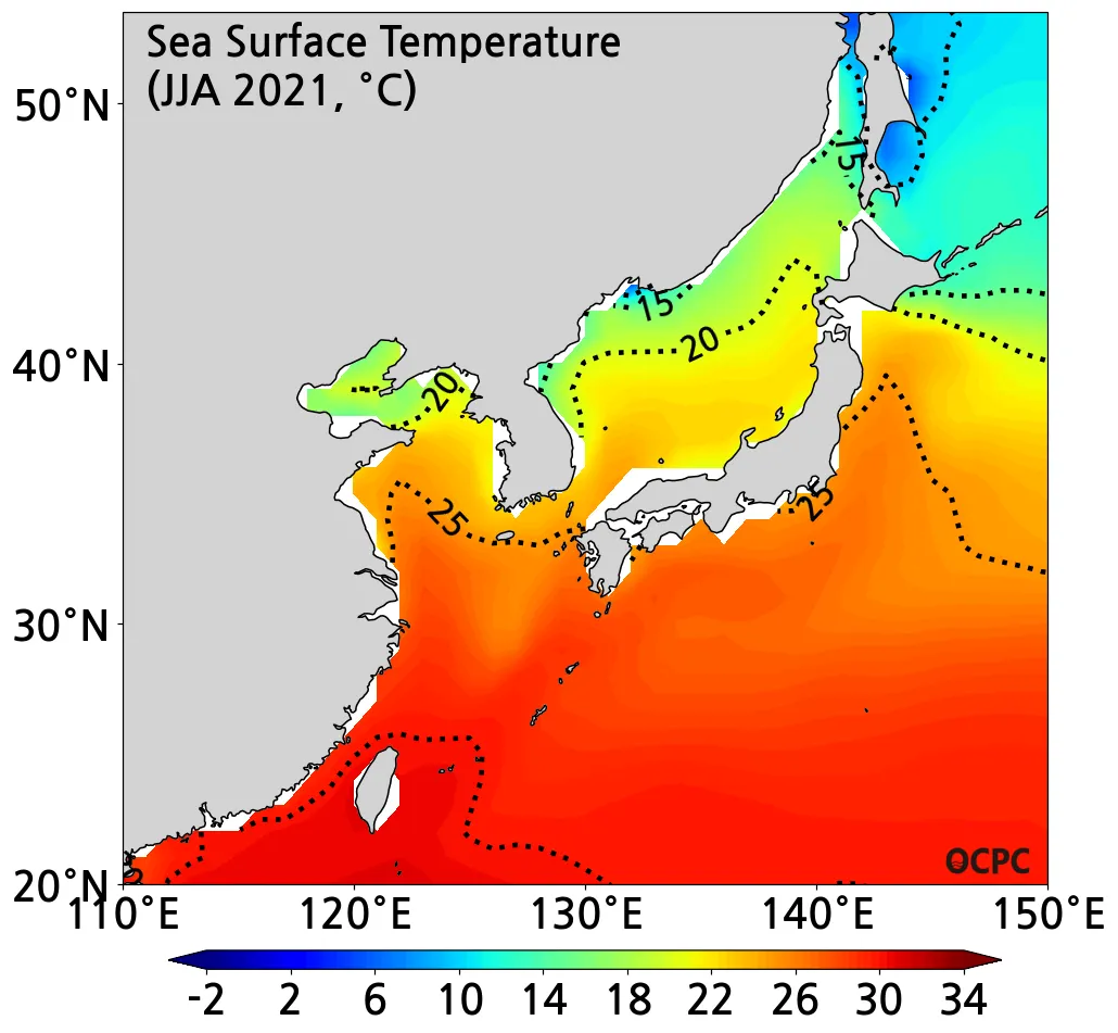 동중국해의 해면수온은 평년보다 높겠으나 황해와 동해는 평년수준을 유지하겠습니다.