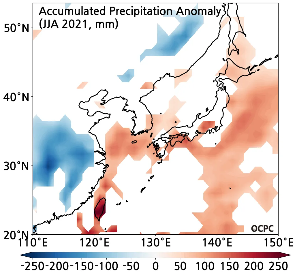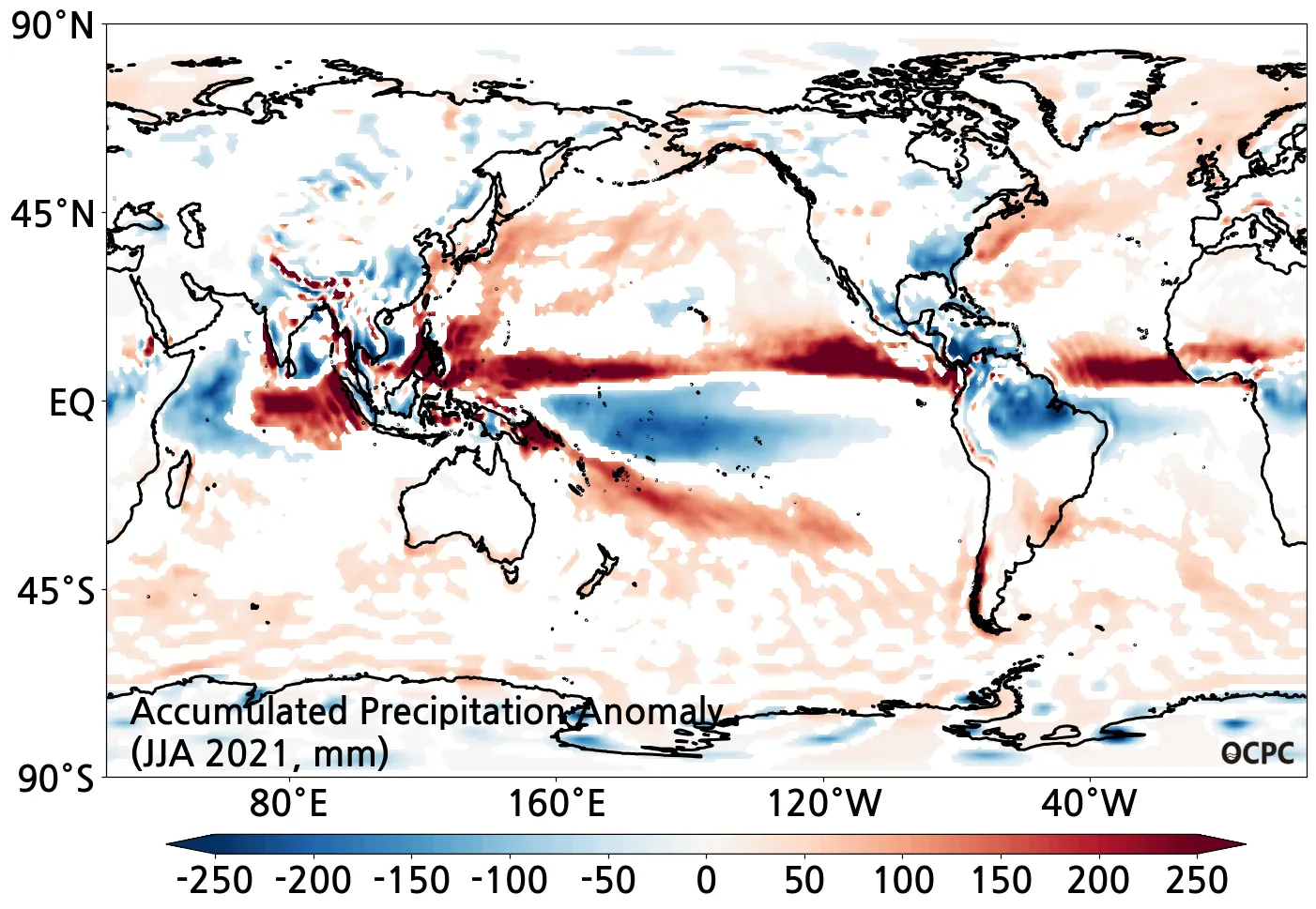 전지구 누적강수량 편차 전망(2021년 6~8월 평균, 채색표시: 평년 표준편차 초과 해역)