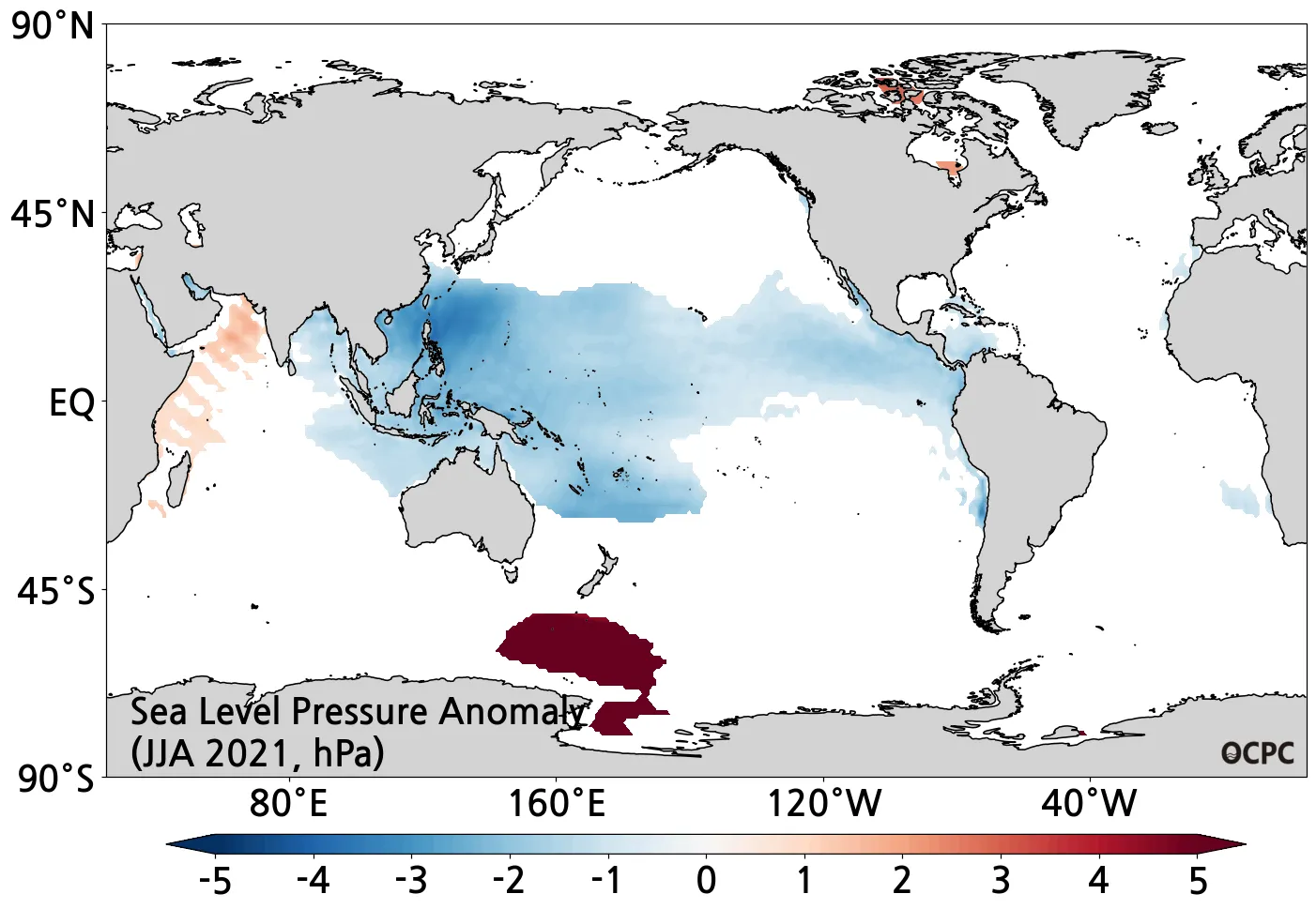 전지구 해면기압 편차 전망(2021년 6~8월 평균, 채색표시: 평년 표준편차 초과 해역)