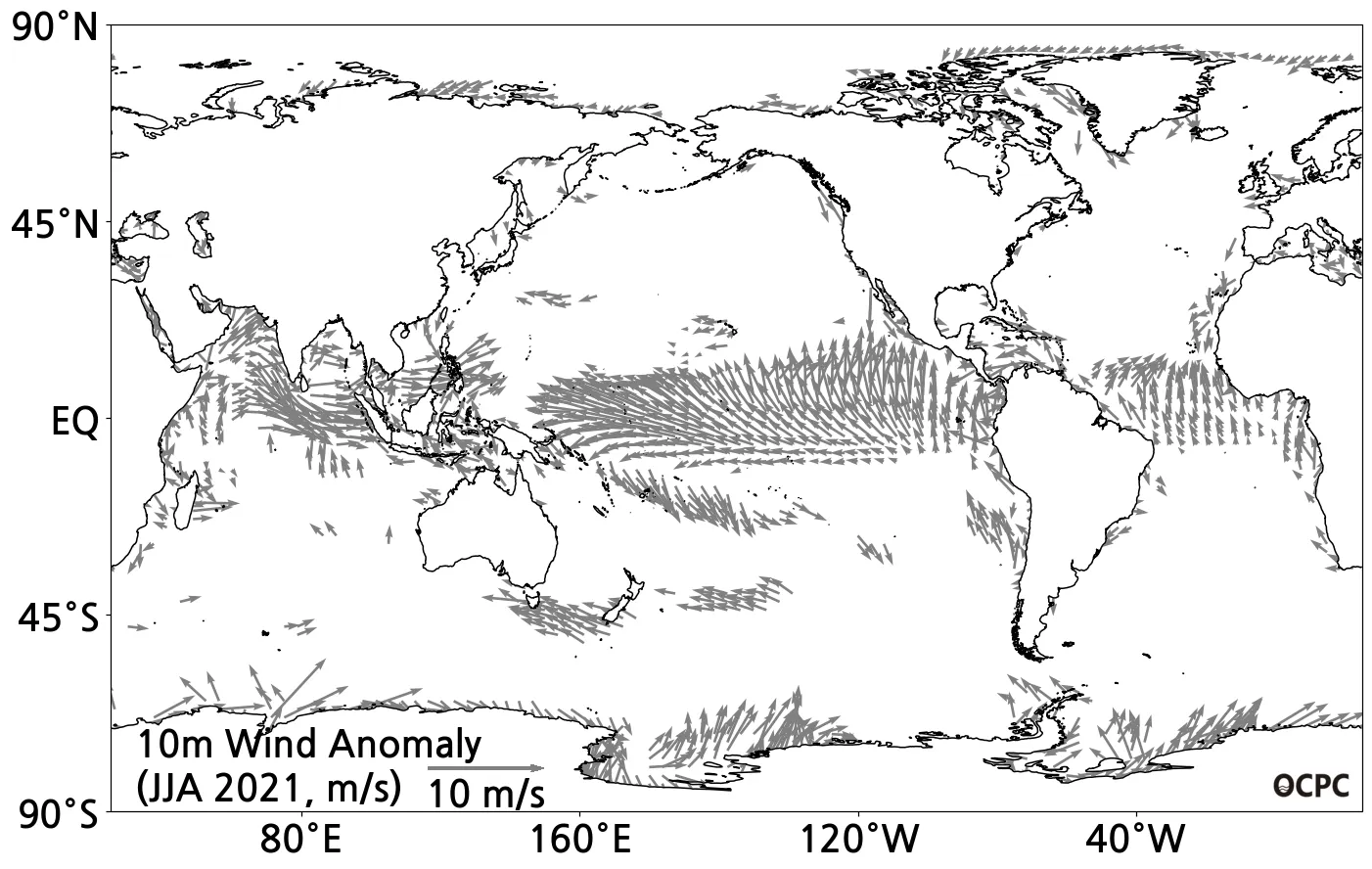 전지구 해상풍 편차 전망(2021년 6~8월 평균, 벡터: 평년 표준편차 초과 해역)