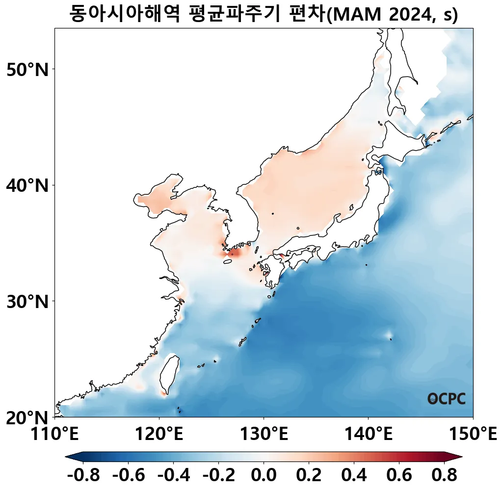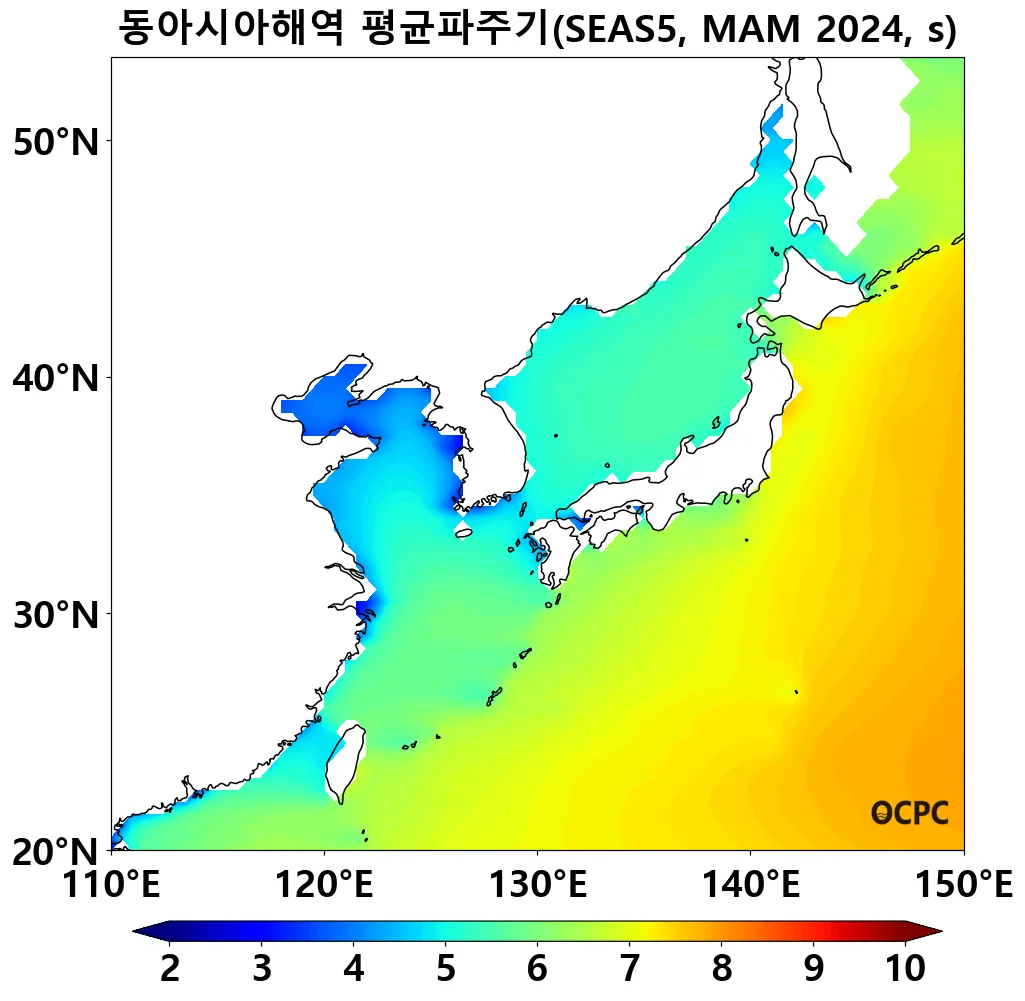 동아시아해역의 3~5월 평균파주기는 평년(6.86±0.10초)보다 0.34초 감소할 것으로 전망됩니다.