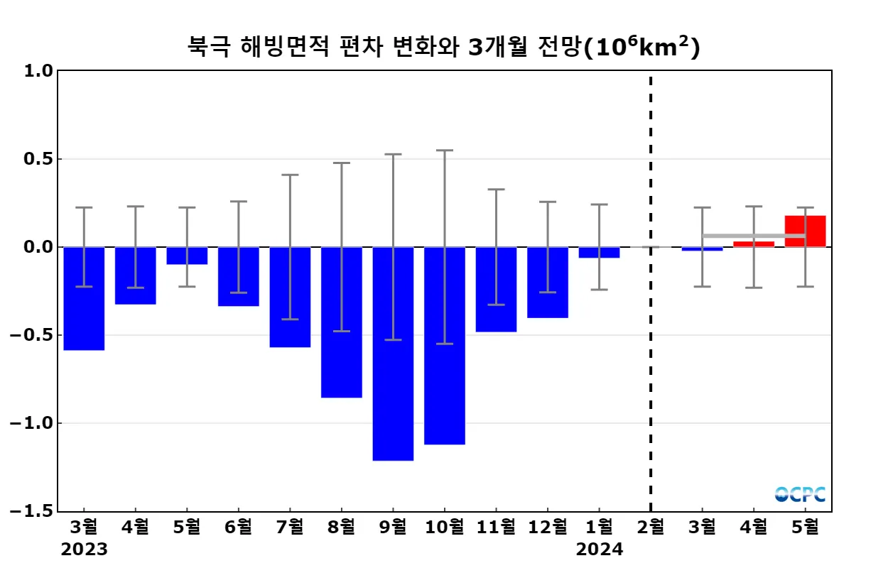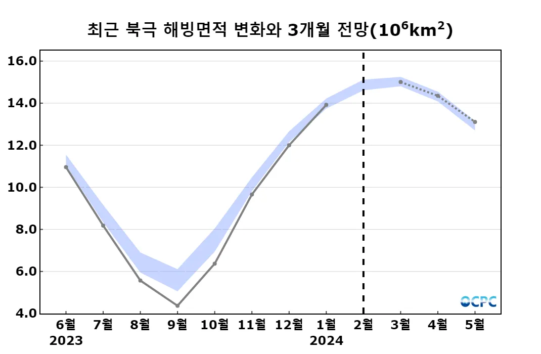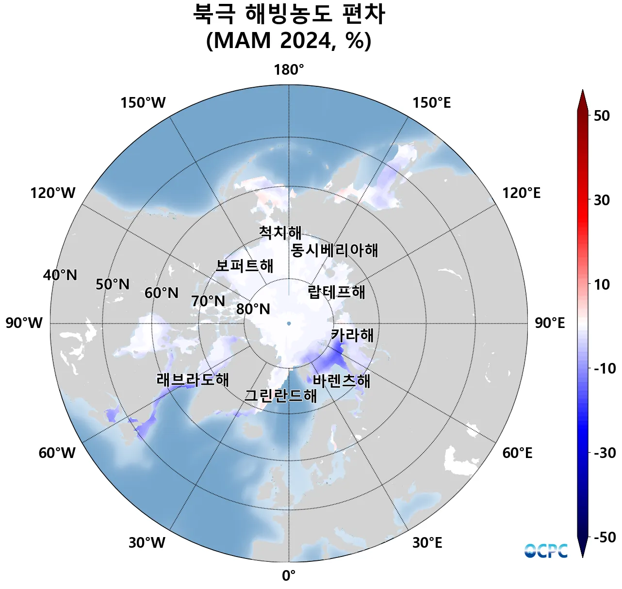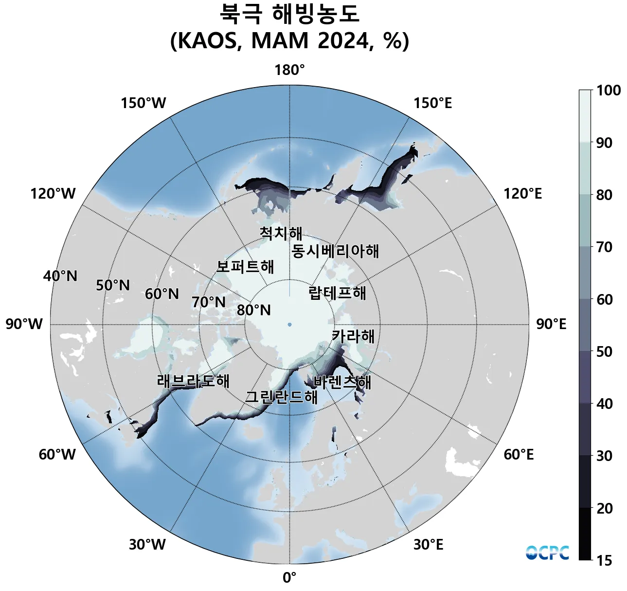 A. 북극 해빙농도 전망(2024년 3월~5월 평균, 15% 이상 해역)