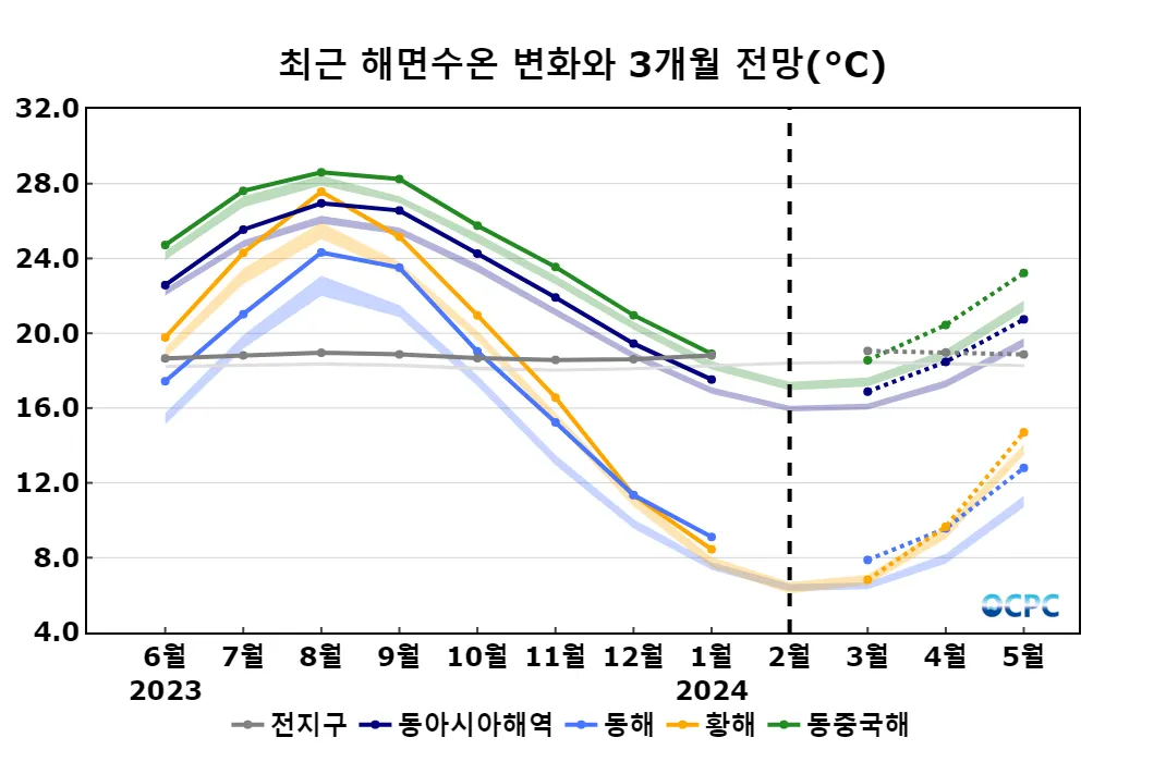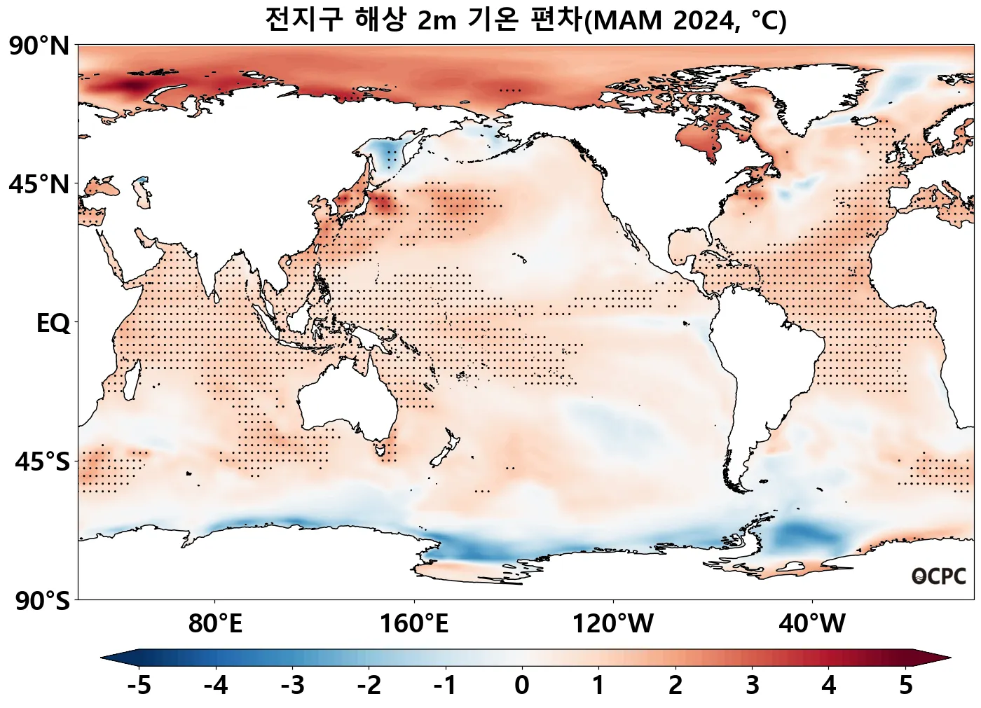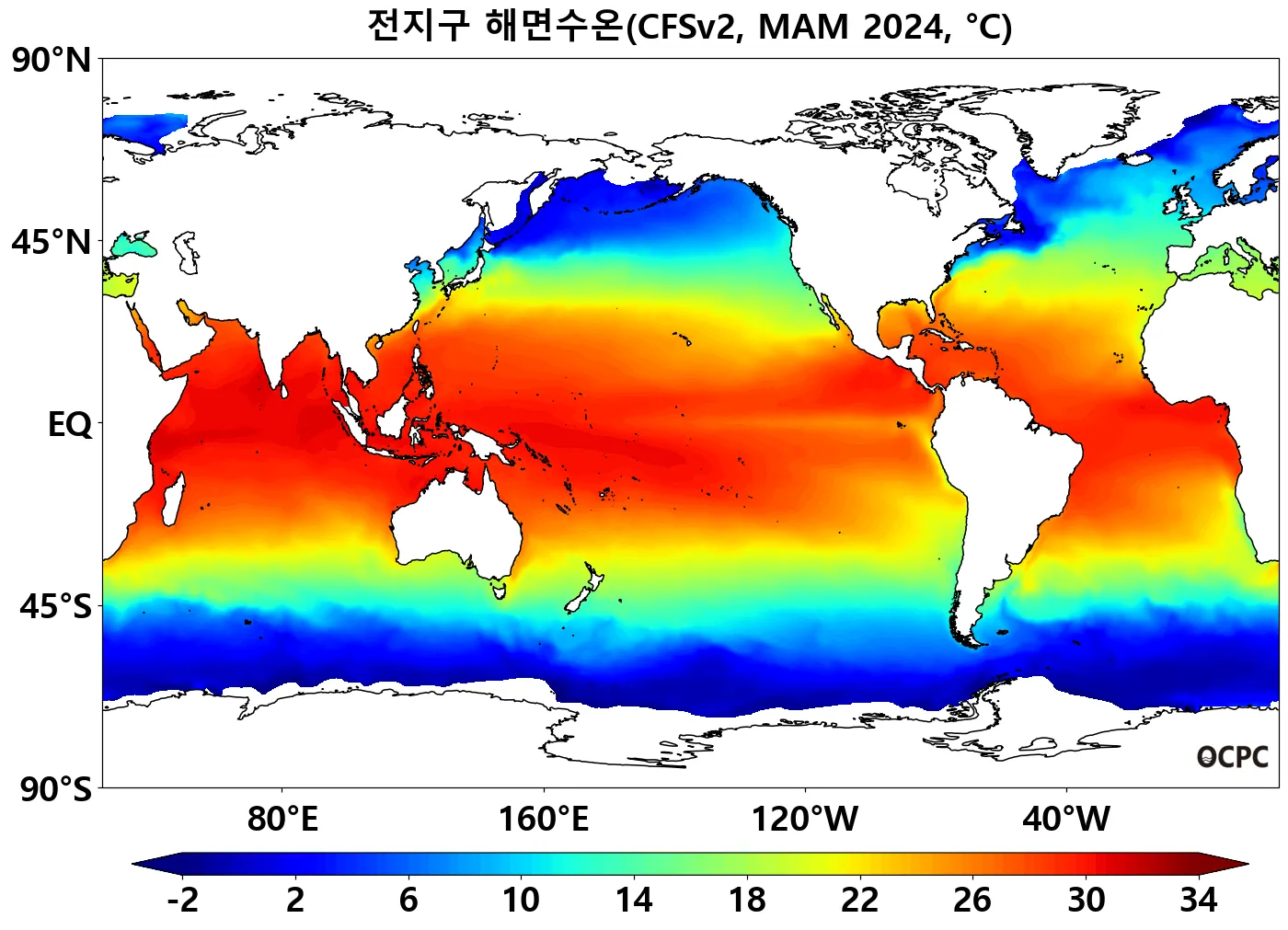 전지구 해상기온이 지난 7월 이후 평년 대비 0.5℃ 이상으로, 3~5월에도 이러한 전지구 온난화가 유지될 것으로 예상됩니다.