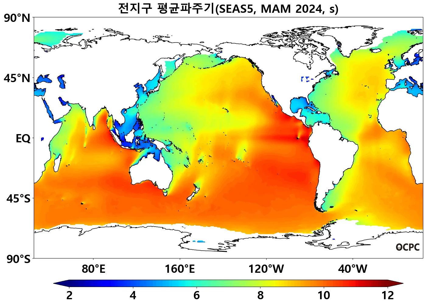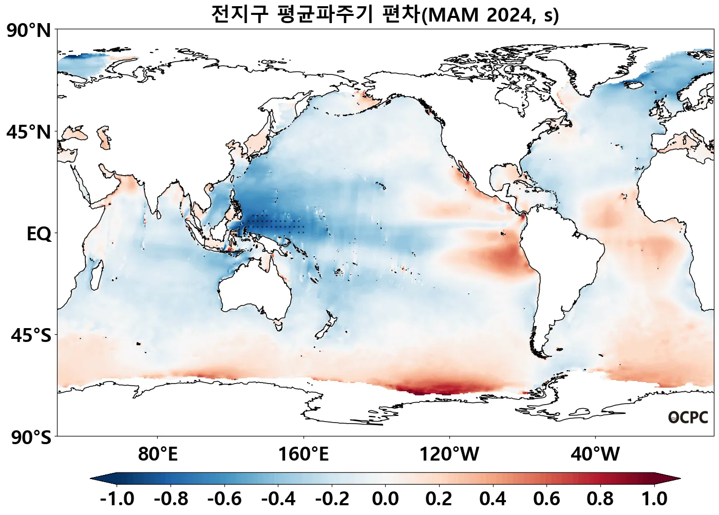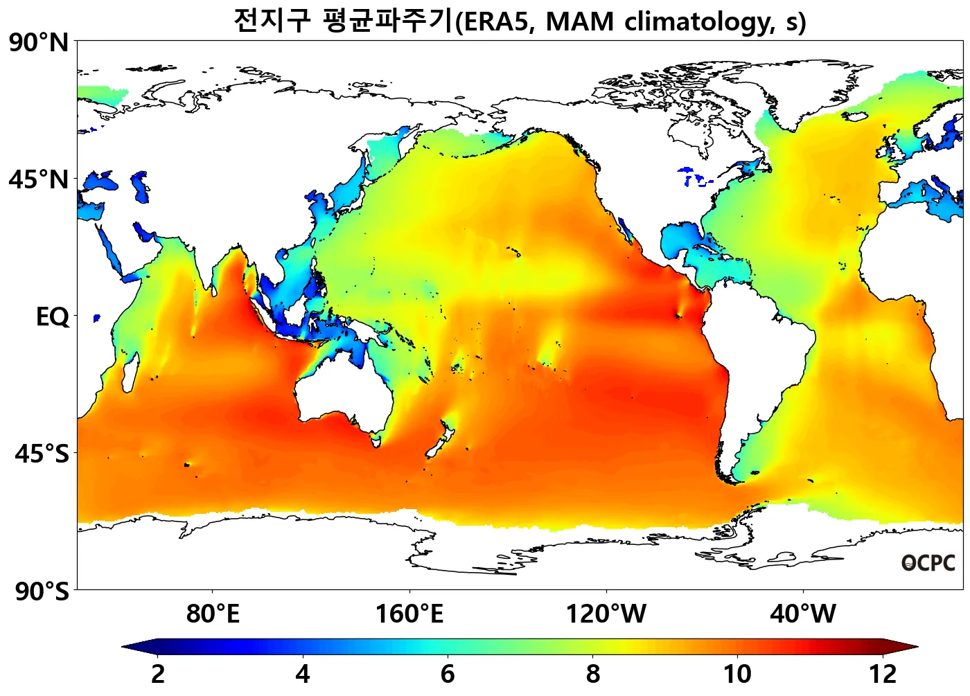 전지구 3~5월 평균파주기는 평년(8.84±0.06초)보다 0.11초 감소할 것으로 전망됩니다.
