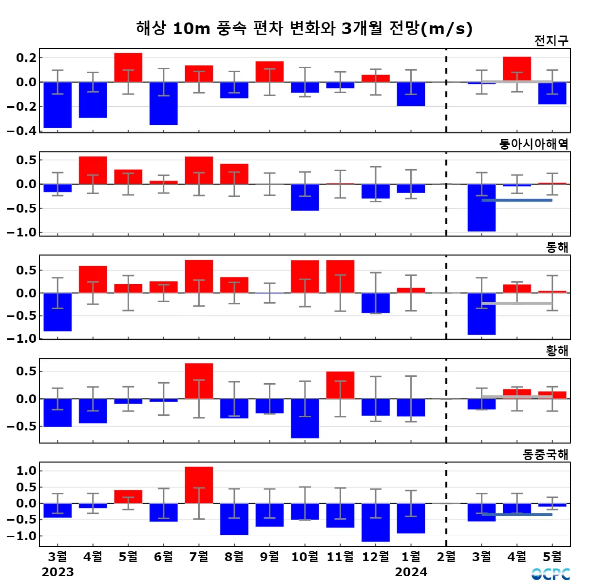 동해, 황해의 3~5월 평균 해상풍은 평년(2.3±0.3m/s, 1.9±0.2m/s)과 비슷하겠으며, 동중국해의 3~5월 평균 해상풍은 평년(2.3±0.3m/s)보다 약하겠습니다.