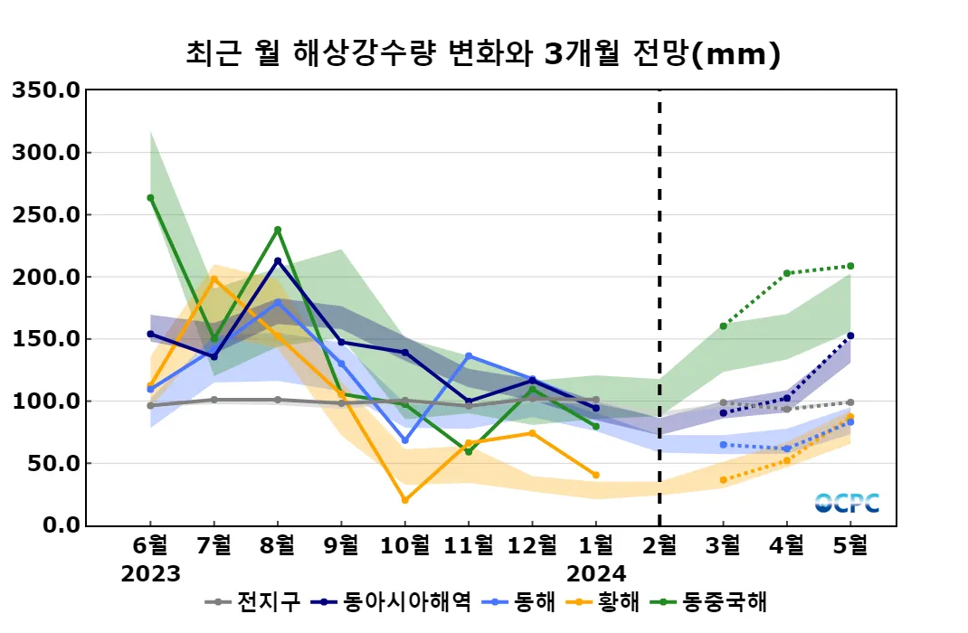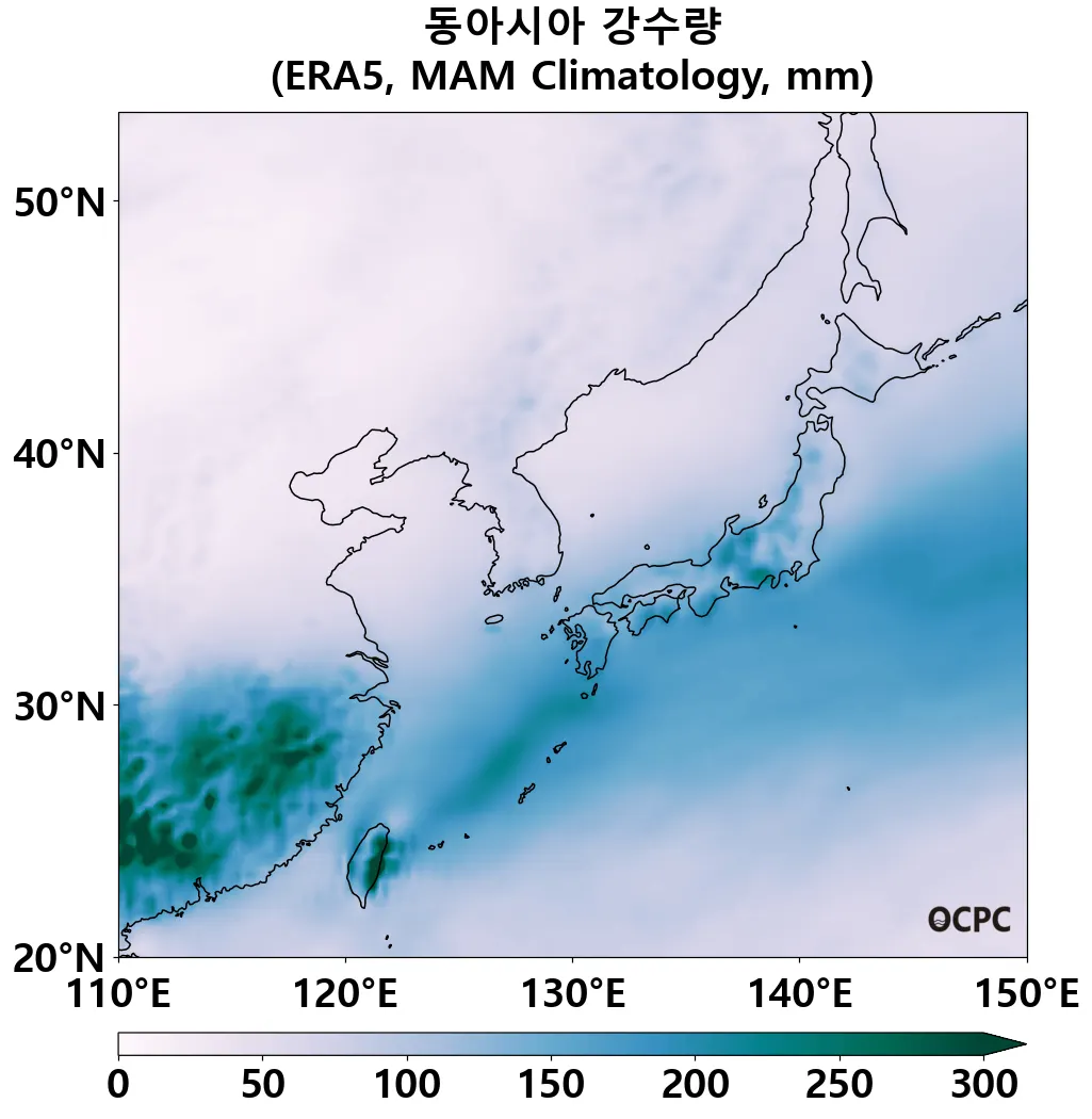 동아시아해역의 3~5월 평균 해상강수량은 평년(111.1±8.4mm)과 비슷하겠습니다.