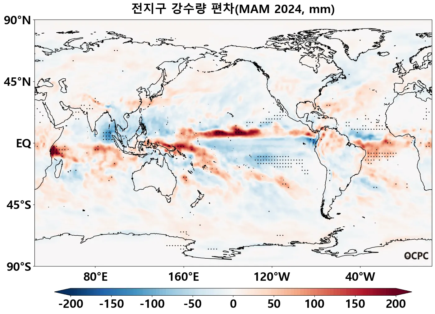 A-B. 전지구 강수량 편차 전망(2024년 3월~5월 평균, 점표시: 평년 ±2 표준편차 초과해역)