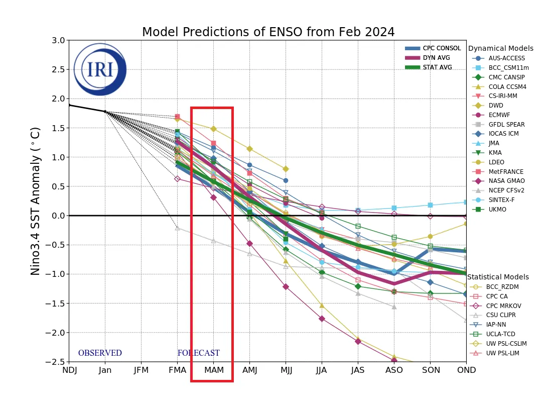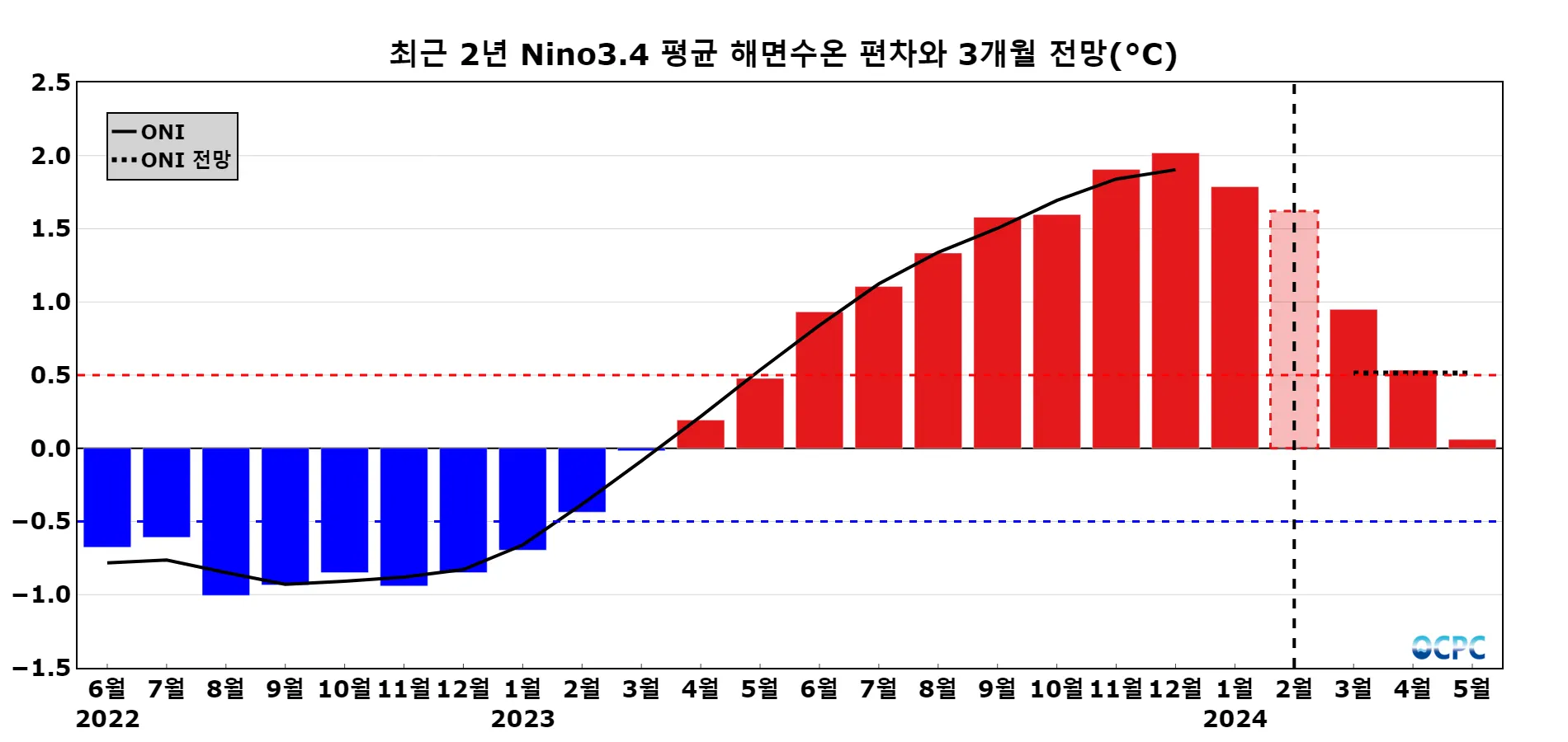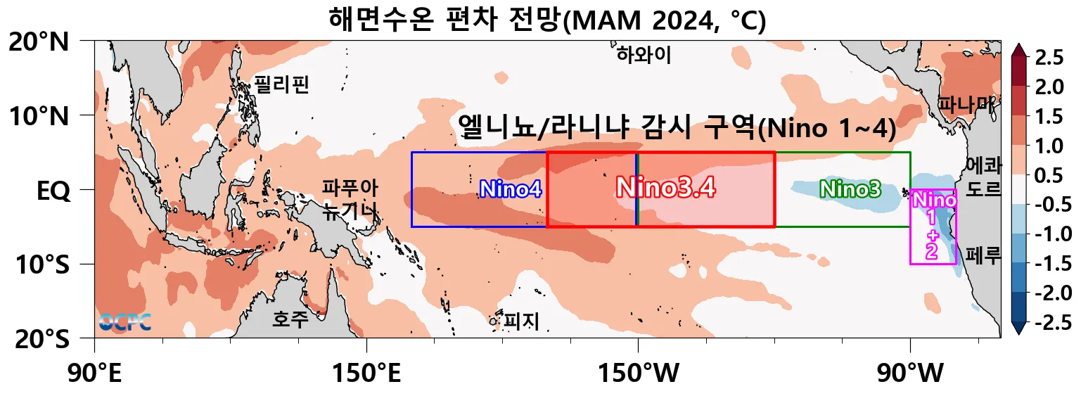 엘니뇨/라니냐 감시구역인 Nino3.4 해역(5°S~5°N, 170°W~120°W)의 2월 1~20일 평균 해면수온 편차는 1.6℃로 엘니뇨 상태이며, 3~5월(MAM) 평균 해면수온 편차는 0.5℃로 전망됩니다.