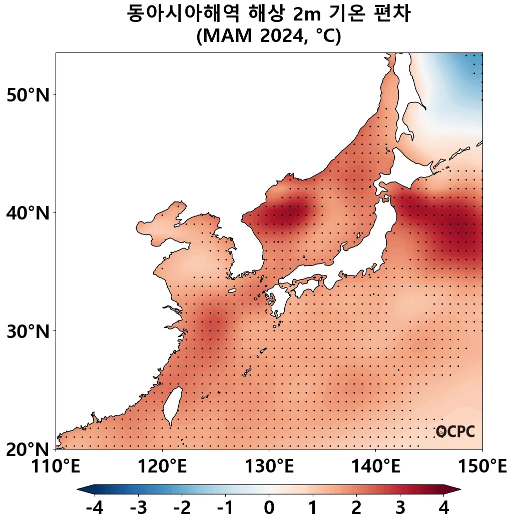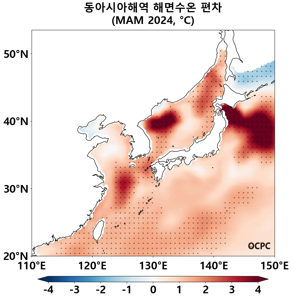 A-B. 동아시아해역 해상기온 편차 전망(2024년 3월~5월 평균, 점표시: 평년 ±2 표준편차 초과해역)