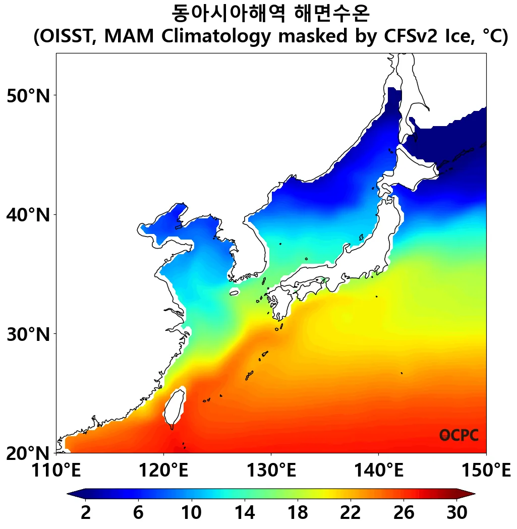 B. 동아시아해역 해면수온(평년 3월~5월 평균), 예상 해빙 해역 제외