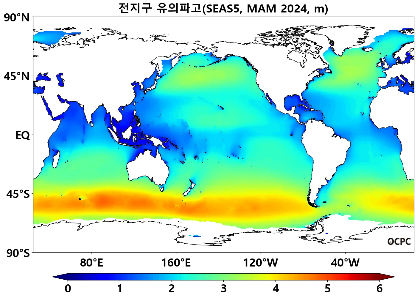 전지구 3~5월 평균 유의파고는 평년(2.43±0.02m)보다 0.03m 증가할 것으로 전망됩니다.