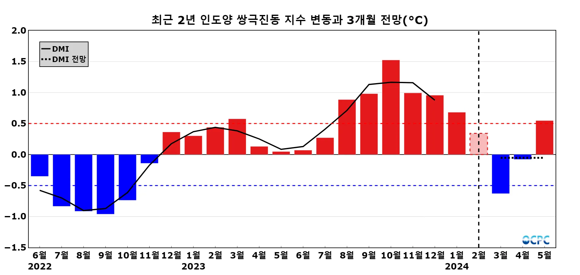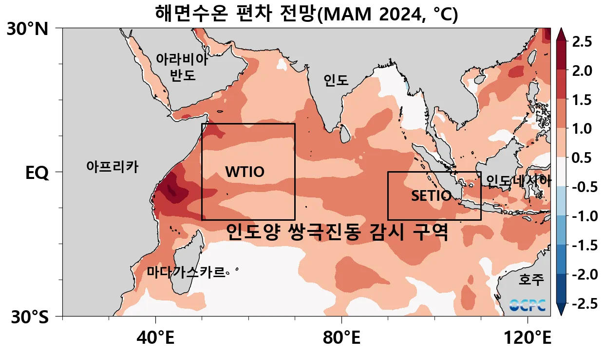 2024년 2월 1~20일 열대 서인도양 해역(WTIO)과 남동인도양 해역(SETIO) 평균 해면수온 평년대비 편차의 차이는 0.3℃로 인도양 쌍극진동 지수는 중립 상태이며, 3~5월(MAM) 평균 편차의 차이도 0.5℃ 이하로 중립 상태가 전망됩니다.