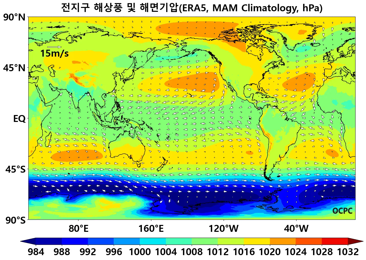 B. 전지구 해상풍 및 해면기압(평년 3월~5월 평균)