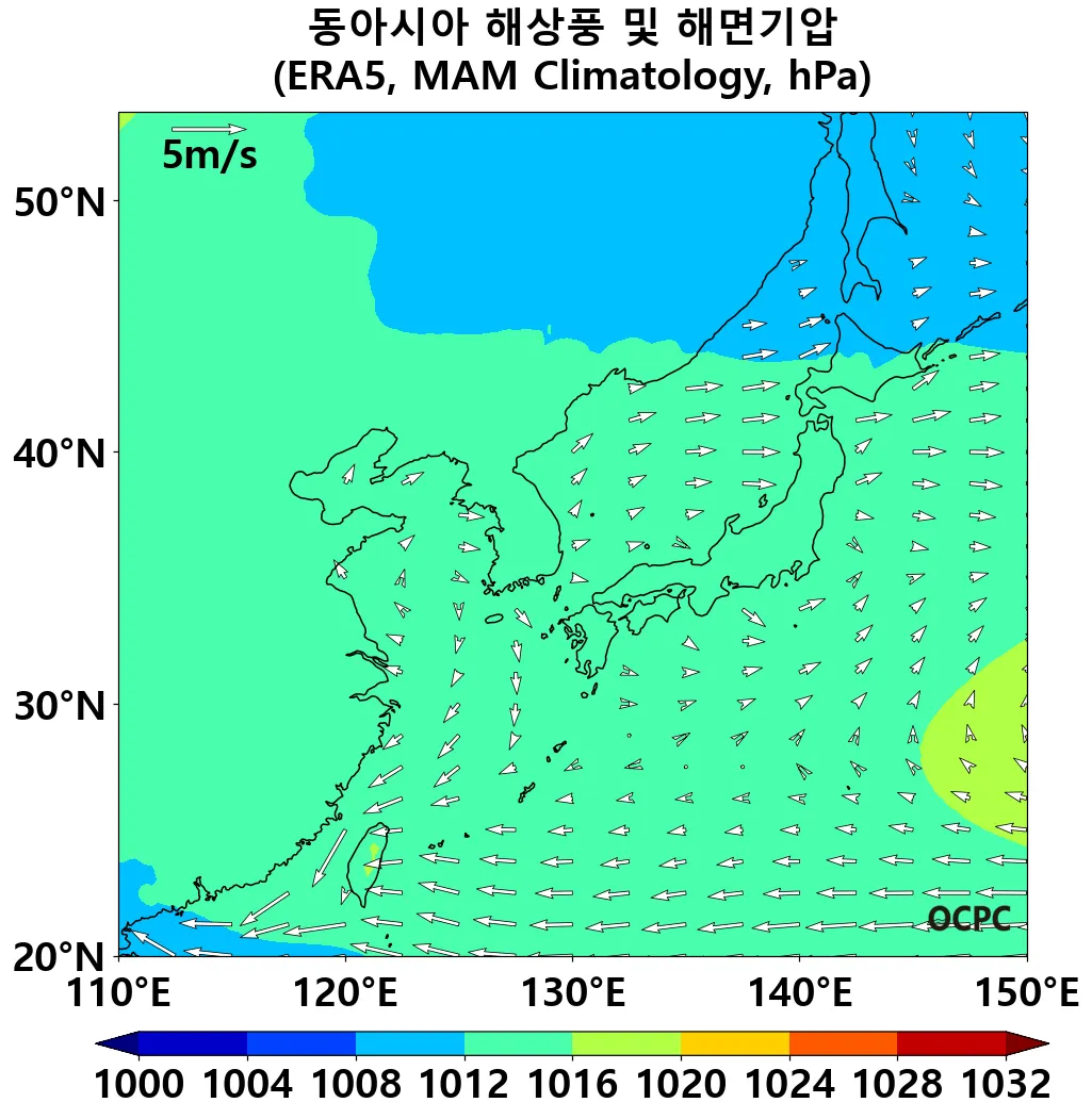 B. 동아시아 해상풍 및 해면기압(평년 3월~5월 평균)