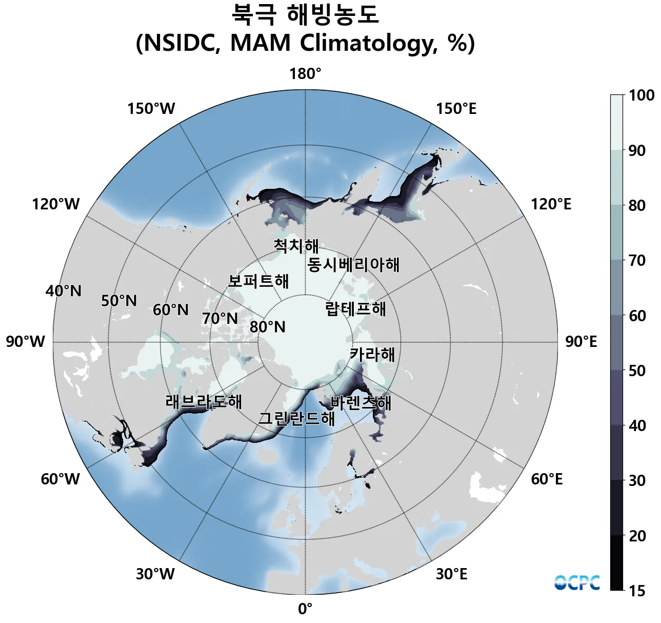B. 북극 해빙농도(평년 3~5월 평균, 15% 이상 해역)