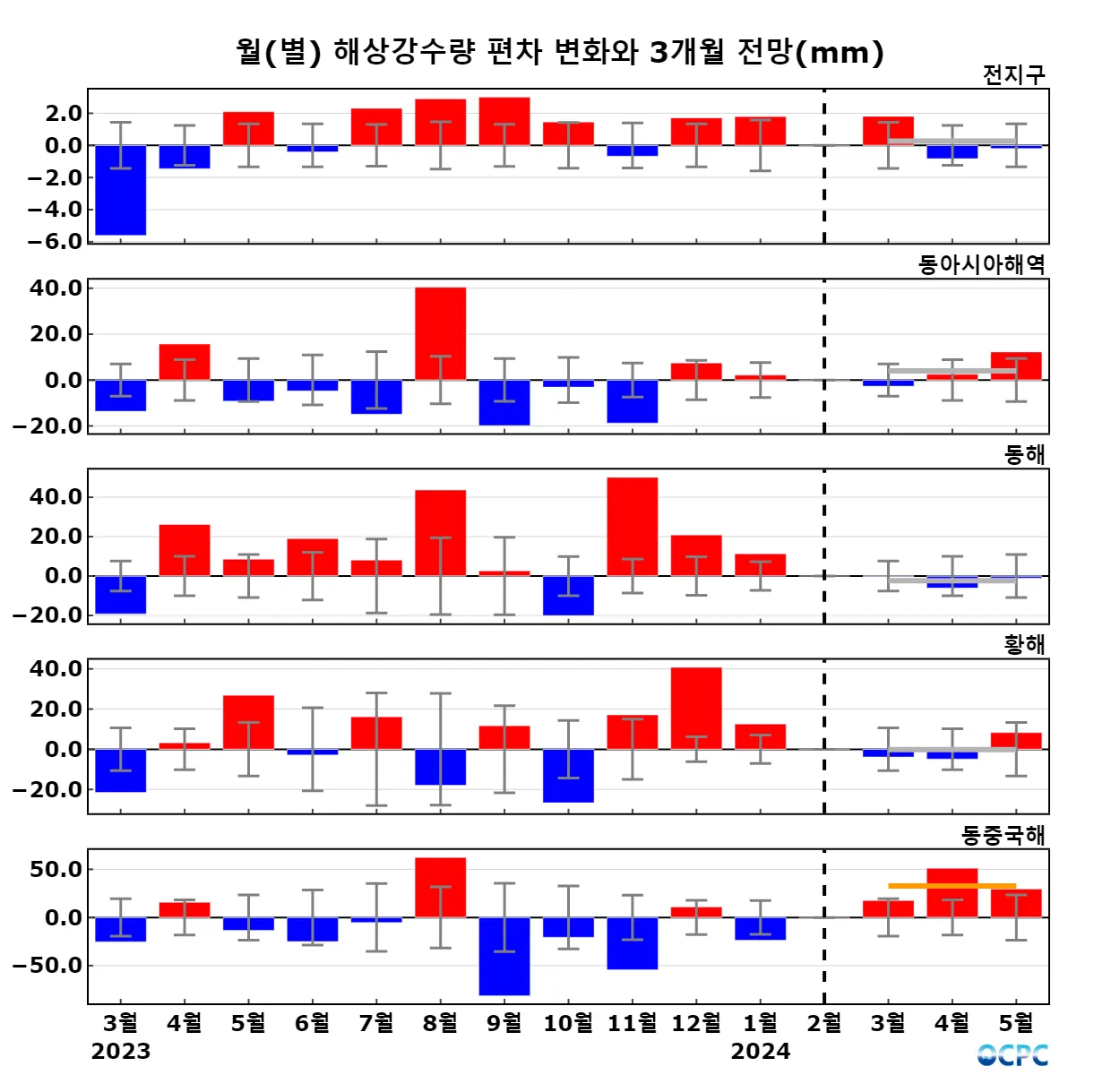 구간표시선: 평년평균±0.5표준편차, 가로실선: 3개월 평균 편차 전망 (주황색: 높음, 회색: 비슷함, 하늘색: 낮음)
