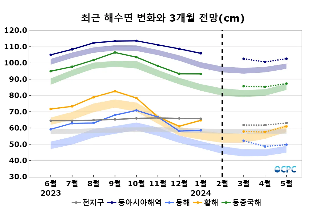 동아시아해역 3~5월 평균 해수면은 평년(96±2cm)보다 높겠습니다.