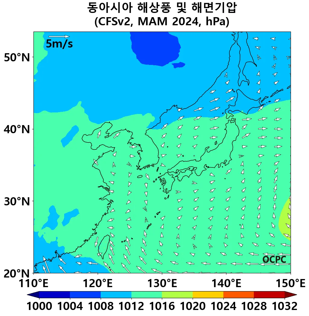 A. 동아시아 해상풍 및 해면기압 전망(2024년 3월~5월 평균)