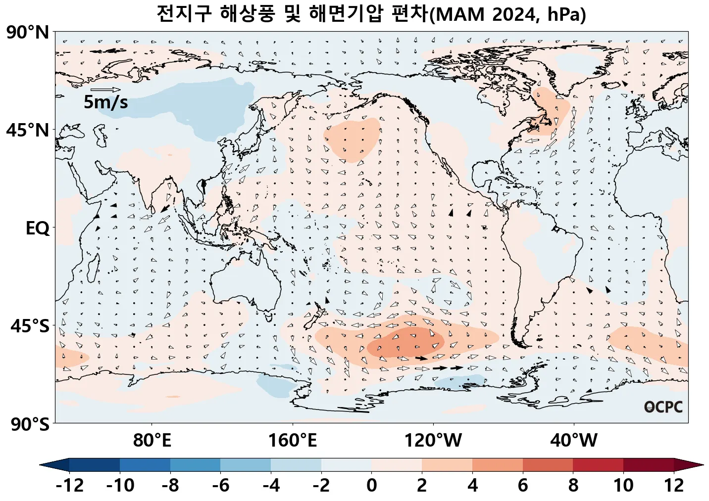 A. 전지구 해상풍 및 해면기압 전망(2024년 3월~5월 평균)