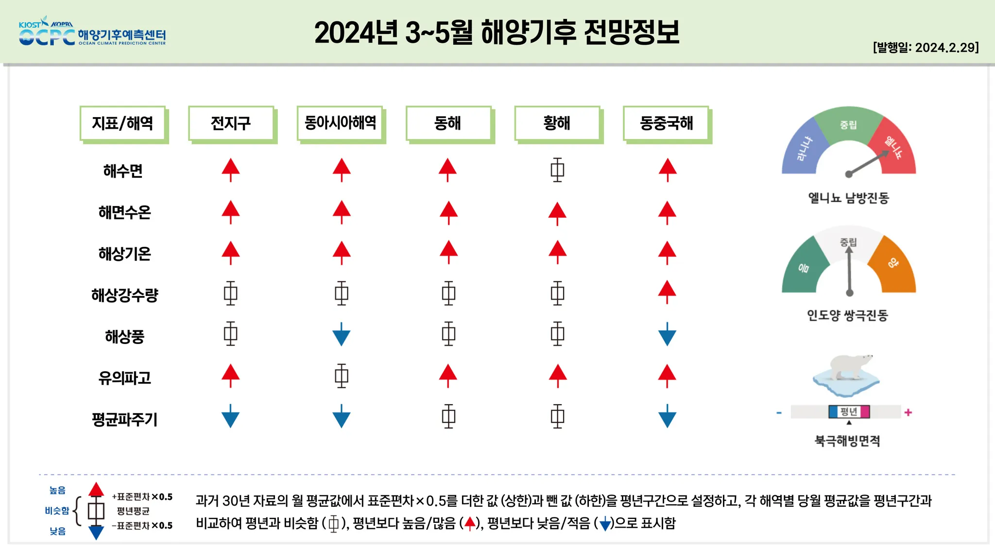 3개월(3, 4, 5월) 평균 전망: 해수면, 해면수온, 해상기온은 전지구, 동아시아해역에서 평년보다 높겠습니다. 3월에서 5월로 갈수록 엘니뇨 감시구역의 해면수온 편차는 점차 감소하여 엘니뇨는 쇠퇴할 것으로 전망됩니다. 인도양 쌍극 진동지수는 중립상태를 유지할 것으로 전망됩니다.